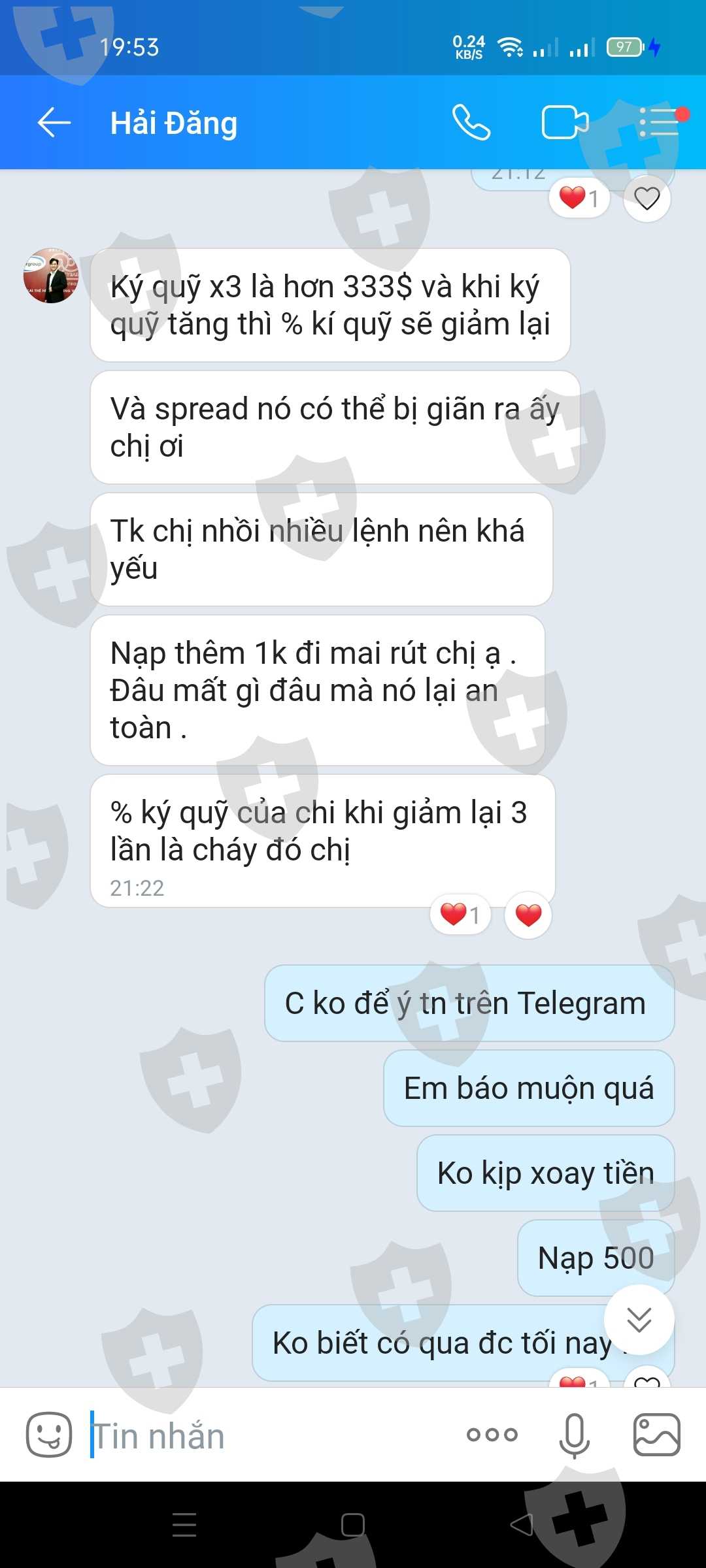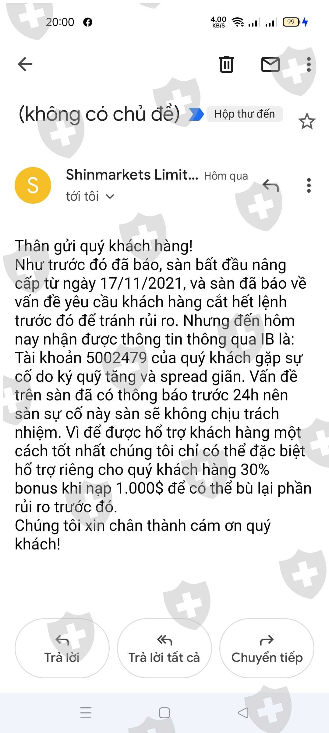 Trước nâng cấp MT5, sàn báo chỉ x3% ký quỹ và nạp tiền vào để giữ tài khoản. Khi nâng cấp MT5 nâng spread lên 1000 3800 làm cháy tài khoản của khách. Cháy tài khoản rùi thì lại nhắn tin là đã báo khách hàng cắt hết lệnh rồi và không chịu trách nhiệm về việc cháy tk của khách.