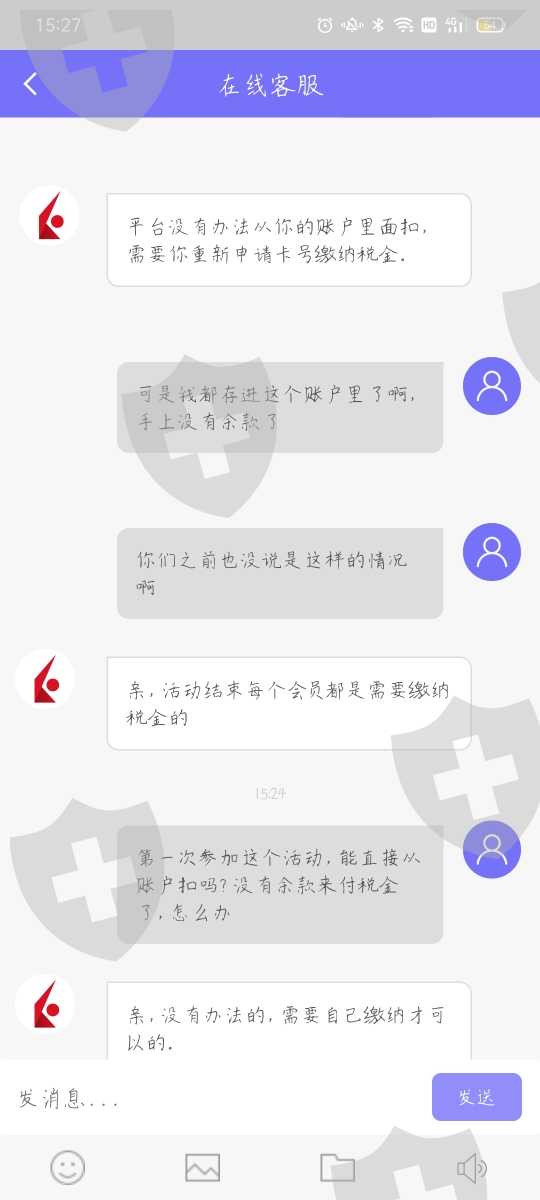 这个外汇交易平台进行诱导活动,我把钱存进去,赚了一些,本来说活动结束了就可以提现,现在又说要缴纳20%的税金,说不能从平台收入中扣,要单独缴纳,钱都投进去了,哪里还有钱缴纳税金啊?联系客服,也不怎么理睬,答非所问,现寻求帮助。