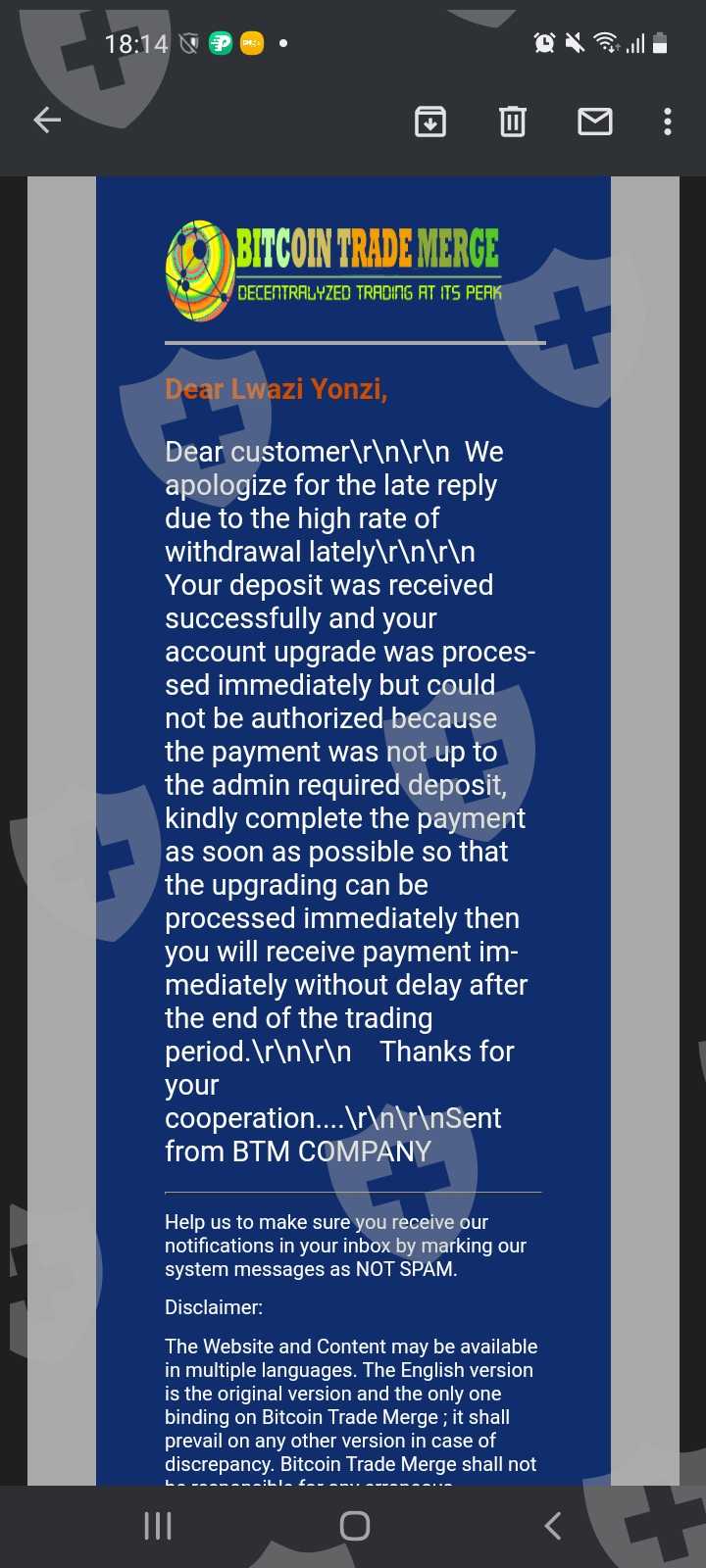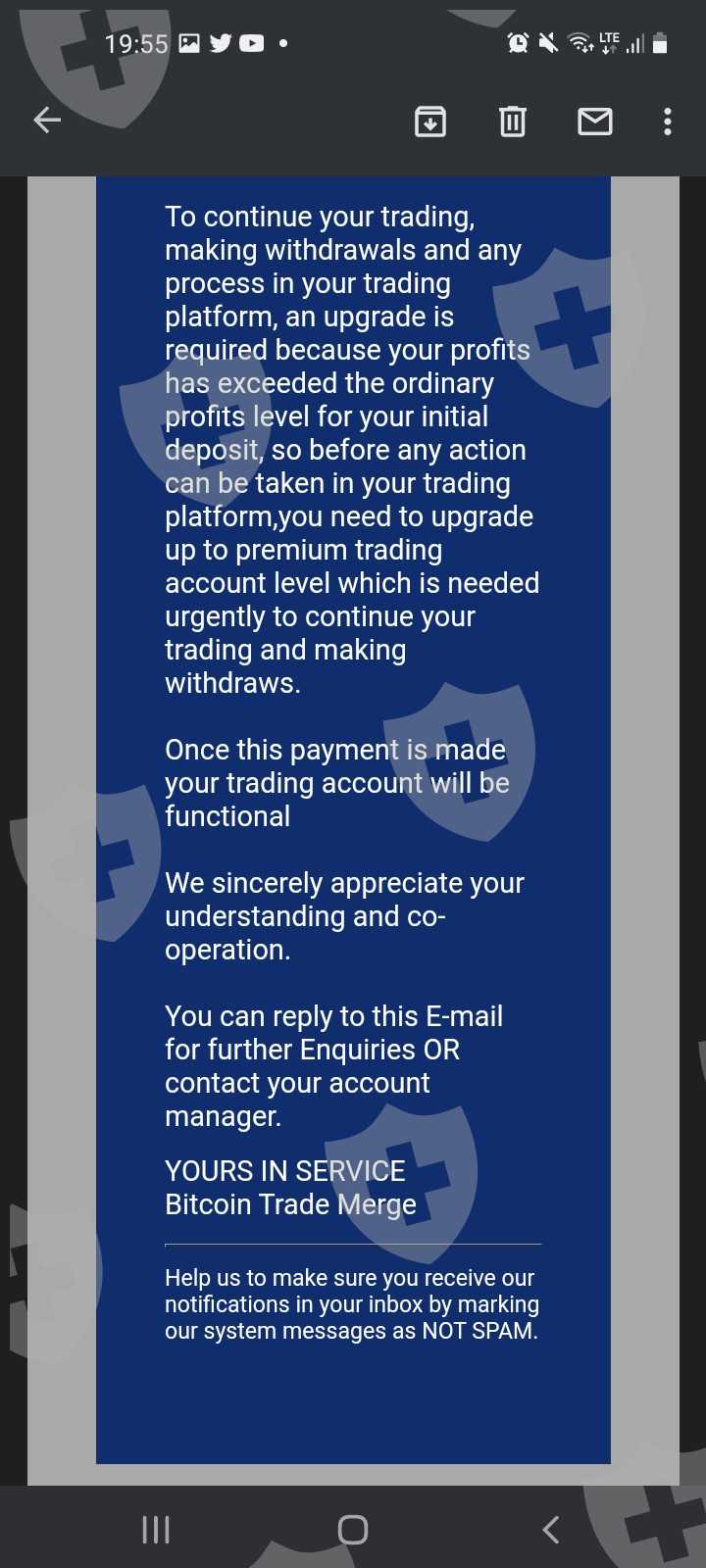 我在BITCOIN TRADE MERGE上投资获得了一些利润后,我被告知我必须升级帐户才能出金,客户经理在他的解释开始时没有提到所有这些附加费用,所以现在我的利润仍然困在他们的平台上