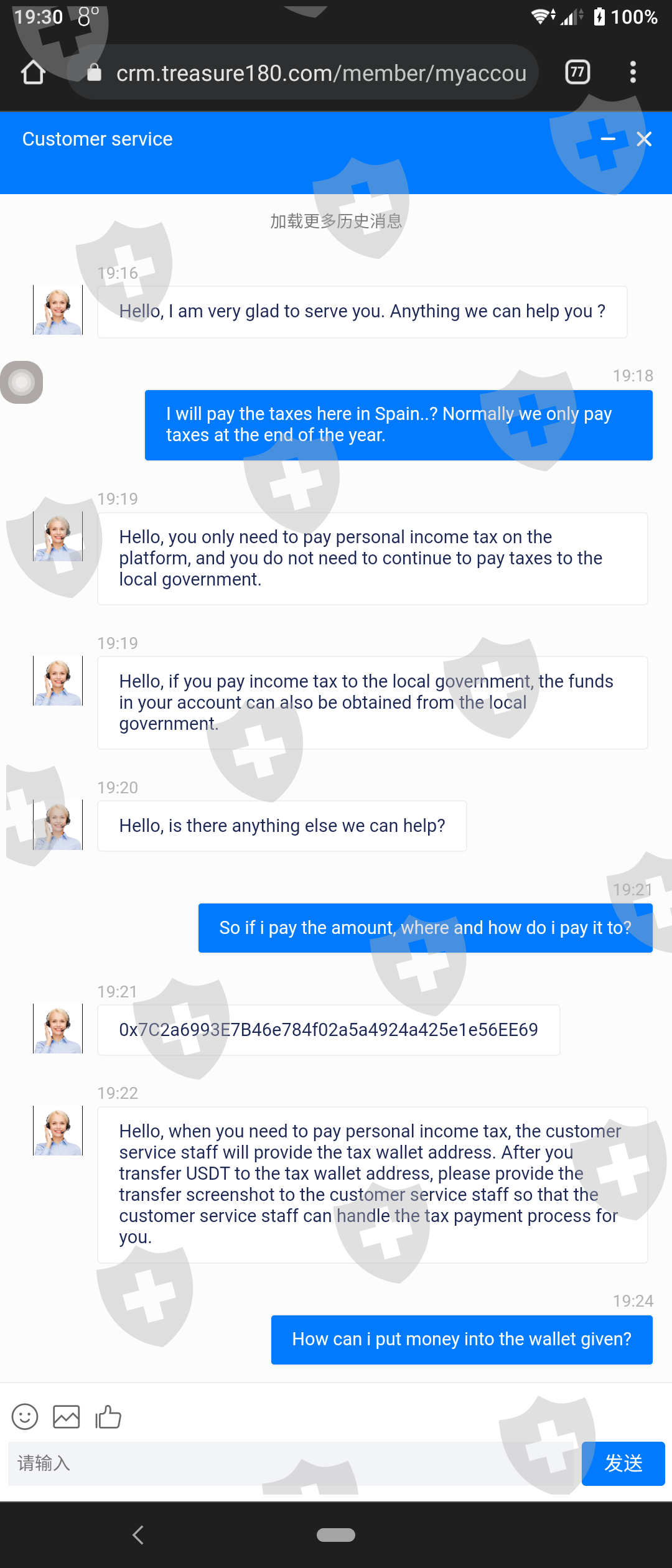 2021 年 11 月 22 日,我成功地从 Treasure 中提取了 12k,但它从未到达 Binance 的收款账户。我的宝藏账户与 MT5 相关联。中间的某个地方,它消失了。当我问 Treasure 发生了什么事时,他们回答说“祝你生活愉快” 然后他们关闭了我的 MT5 所以我不能继续交易并说我必须支付 2766 USDT 的费用才能释放资金,因为我知道这是是假的。我附上了我当时得到的截图。我还被要求将钱汇到一个钱包地址。我要尽快解决这个问题。