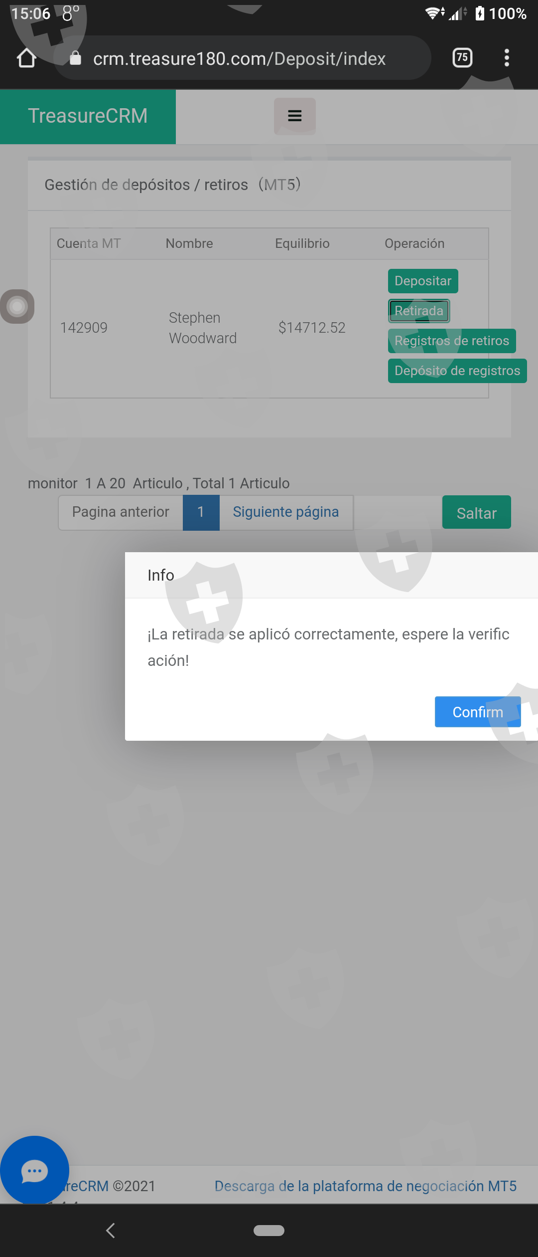 El 22 de noviembre de 2021 retiré con éxito 12k de Treasure pero nunca llegó a Binance, la cuenta receptora. Mi cuenta Treasure está vinculada con MT5. En algún lugar intermedio, desapareció. Cuando le pregunté a Treasure qué sucedió, respondieron "que tengas una buena vida". Luego cerraron mi MT5 para que no pueda seguir operando y dijeron que tengo que pagar una tarifa de 2766 USDT para liberar los fondos debido a un impuesto personal, que sé que ser falso. Adjunto las capturas de pantalla que obtuve en ese momento. También me pidieron que enviara el dinero a una dirección de billetera. Quiero que este asunto se resuelva lo antes posible.