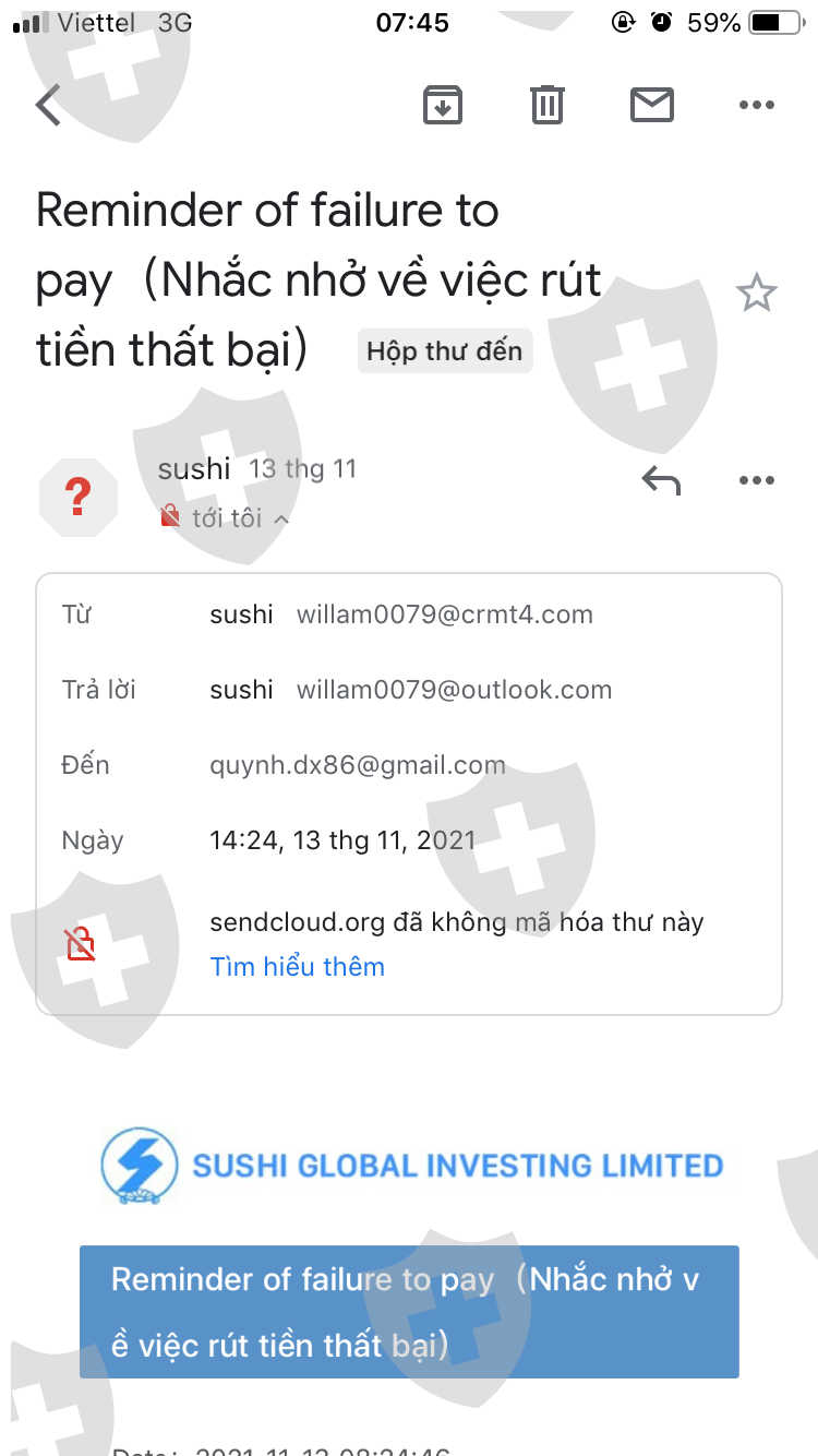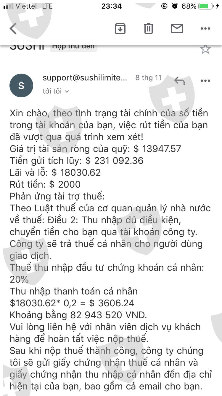tôi có iên hệ chăm sóc khách hàng sàn usdc để mở tài khoản. sau khi nhận được Mail Thông báo mở tài khoản thành công. nhận thấy gmail gửi cho tôi và gmail của sàn sushi cùng 1 địa chỉ. cùng 1 tổ chức lừa đảo không cho rút tiền. tôi đã mất 18.030$ mà không được rút chăm sóc khách hàng yêu cầu tôi nộp 20% thuế không sẽ khoá tài khoản tôi. yêu cầu usdc gobal Limited và sushi gobal Limited trả tiền cho tôi