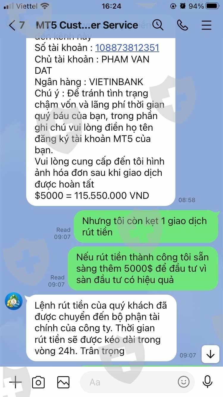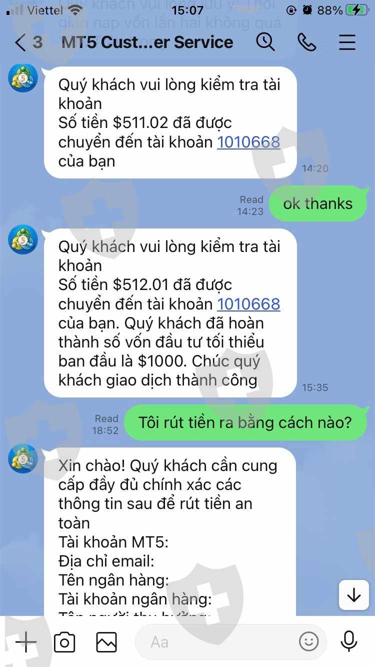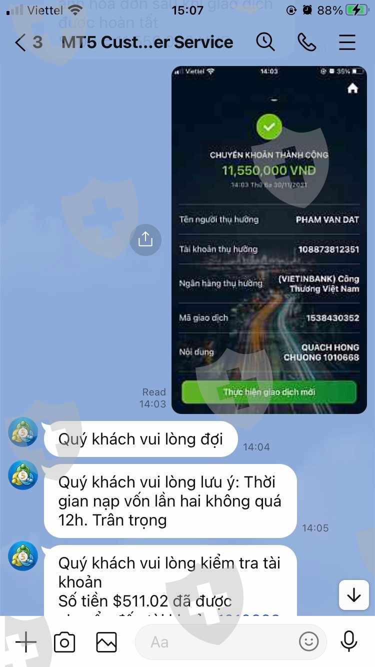 Vào 14h03 ngày 30/11/2021 tôi đã chuyển 500$ vào sàn, một người khác (nghi vấn là nhân viên của sàn) tự nguyện cùng tôi nạp 500$ nữa tổng cộng là 1000$ trên tài khoản. Khi tôi yêu cầu rút tiền thì sàn không phản hồi.