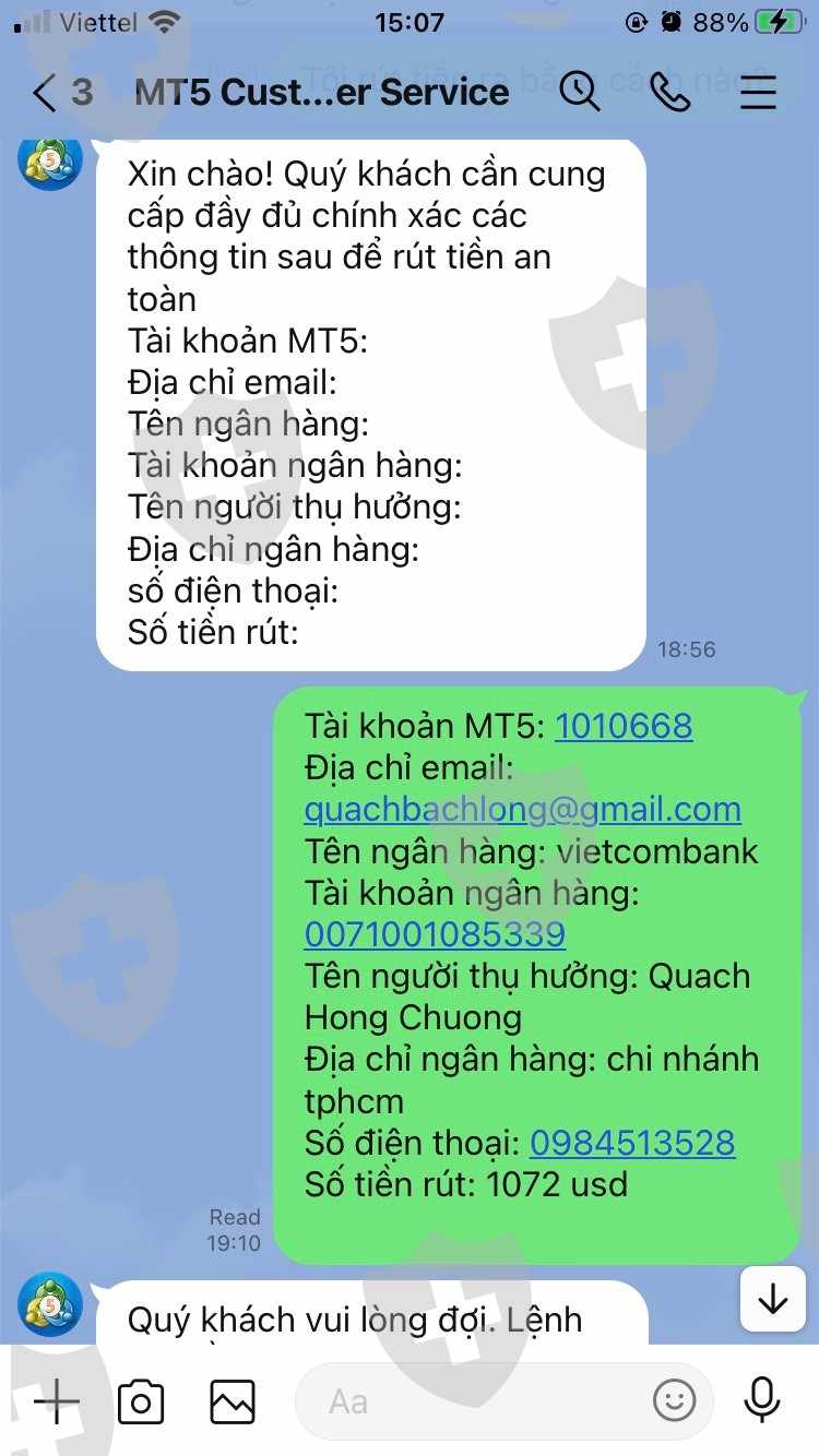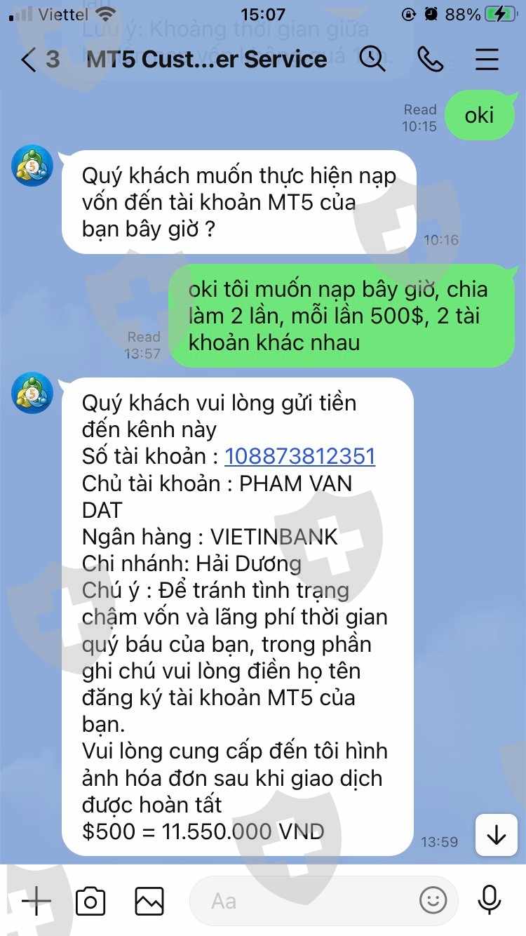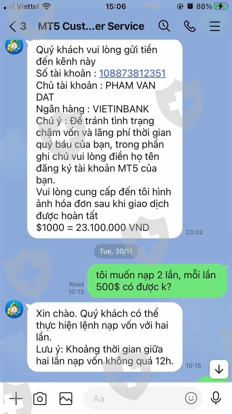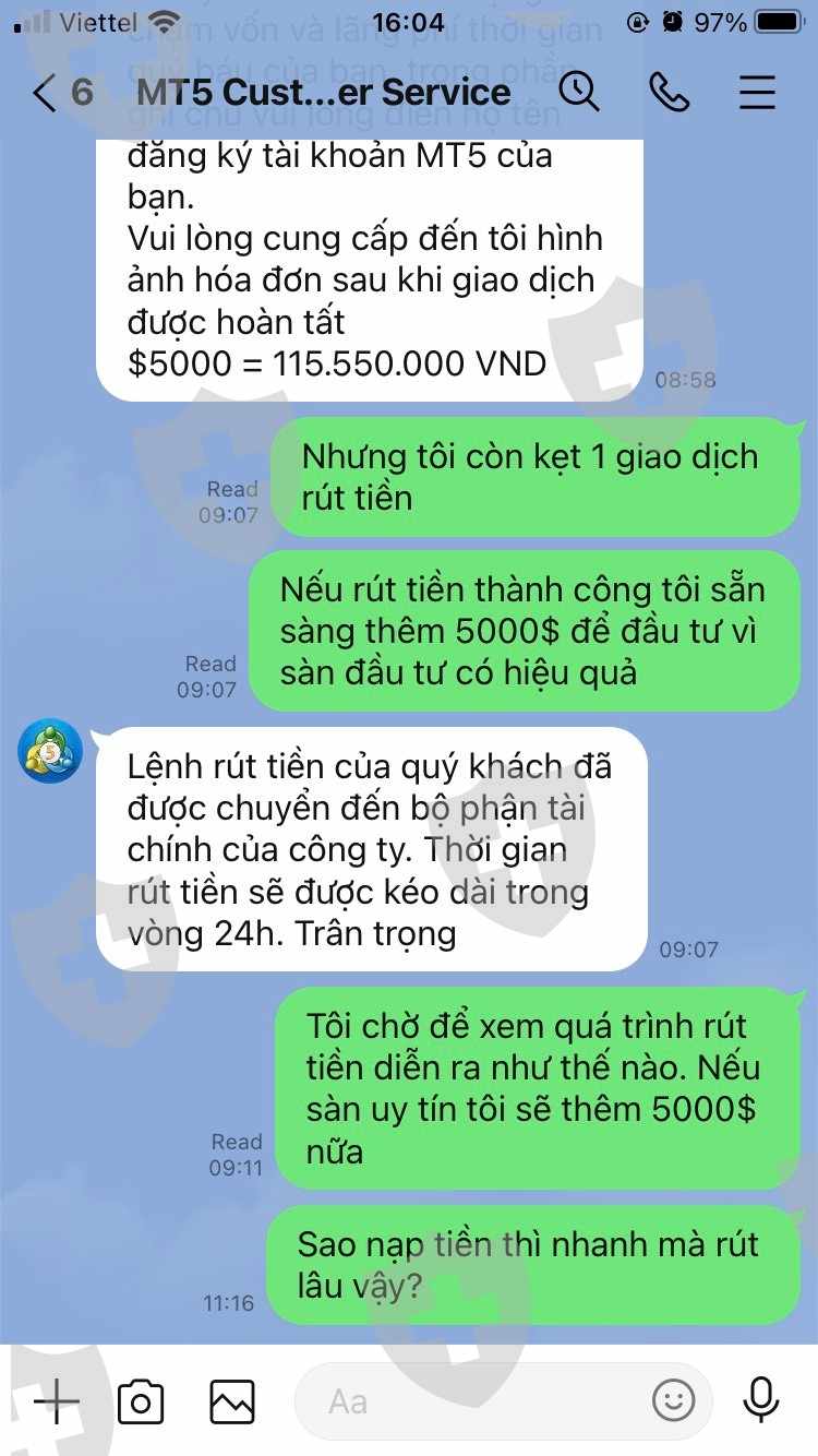 Vào 14h03 ngày 30/11/2021 tôi đã chuyển 500$ vào sàn, một người khác (nghi vấn là nhân viên của sàn) tự nguyện cùng tôi nạp 500$ nữa tổng cộng là 1000$ trên tài khoản. Khi tôi yêu cầu rút tiền thì sàn không phản hồi.