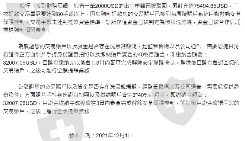 申請出金2000USD卻收到mail客服的mail被駁回,說累計充值75494.65USD,三次提款交易量需要達到80手或以上,才可以出金,但是我需要用到我的資金,卻被硬是說我涉嫌洗黑錢。明明是我的帳戶,卻要被你受控,法律哪一條說我要繳自證金才可以澄清我不是洗錢的。而且繳錢也不是繳給政府機關,而是繳給卷商。這是變相的強迫入金。