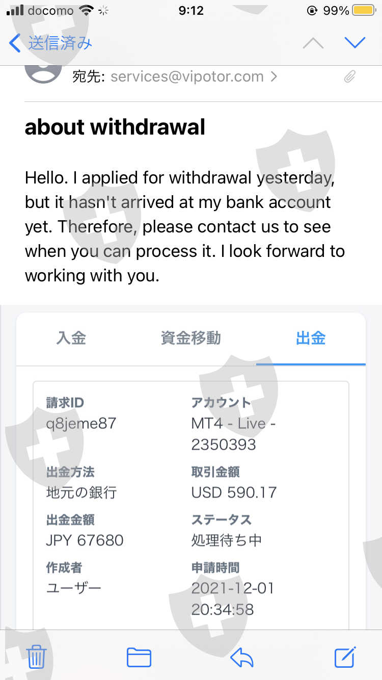 Vipotorの取引所は限りなく、詐欺会社の可能性が高いと思いますので、出金に応じるように調査をして頂きたくお願い致します。