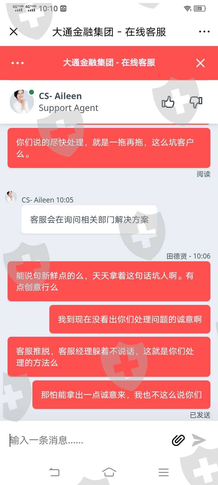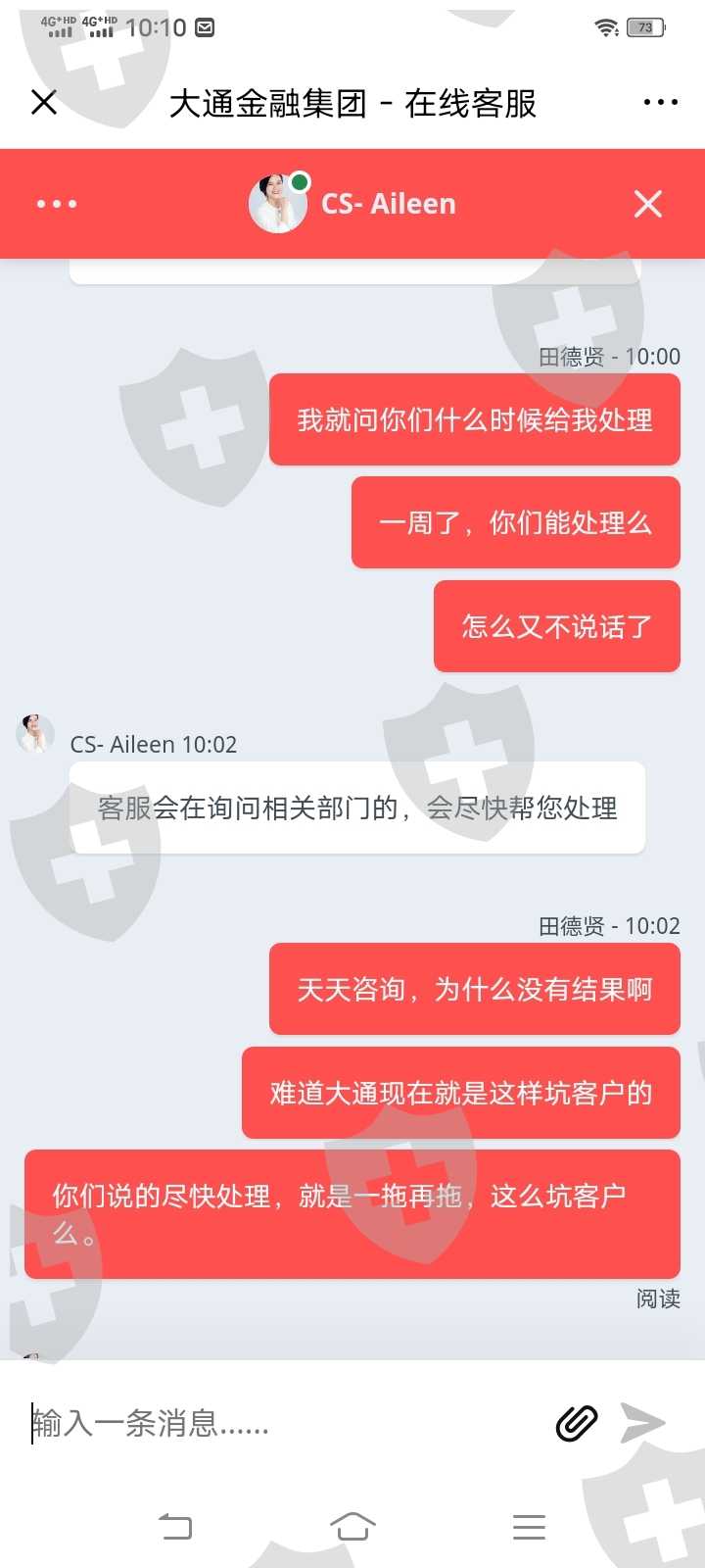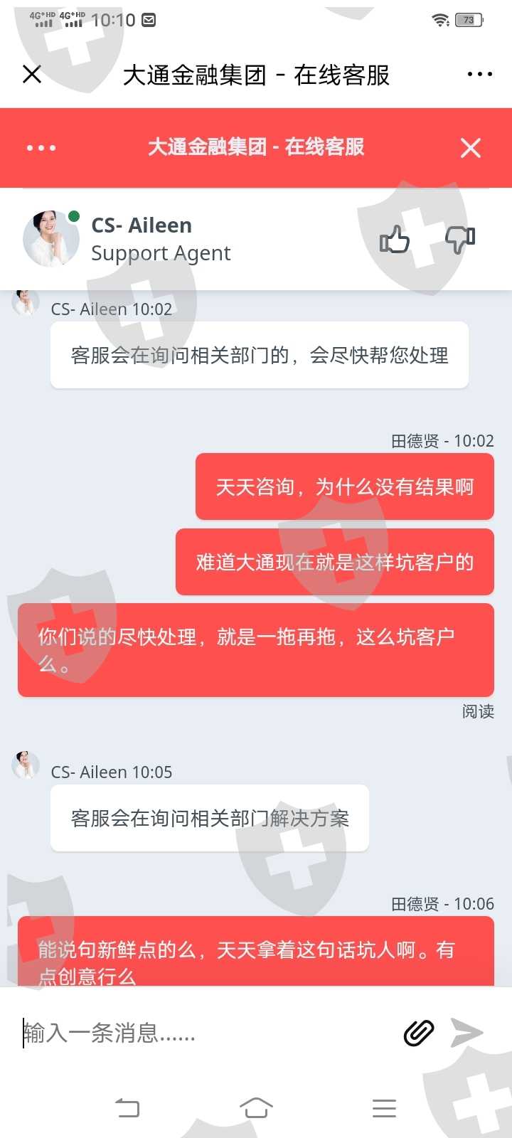 因为他们后台出问题,客服经理不说话,客服人员推脱责任,整天就是想着怎么欺骗隐瞒客户,自己说两天解决问题,一周没见回复,说的平台百分之五十强平,客服经理一周了才给回复,说不管,金额太小了,这是人能说出的话么,大通金融,改制以后就是一个标准的骗子公司