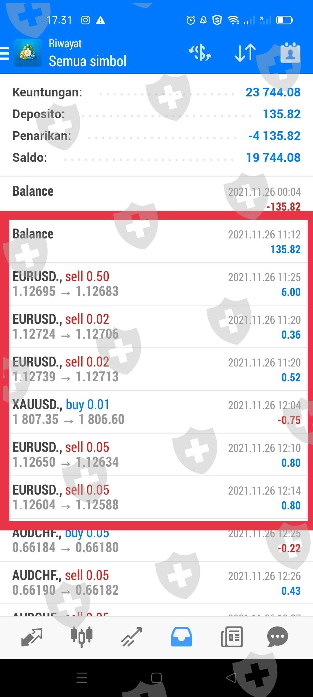 2021 年 12 月 26 日,在 18:00 WITA。像往常一样,我用我之前的余额进行交易。我尝试过 wd 但由于过程太长,我取消了它。然后我用 chf 货币对进行交易,因为我看到了我交易的 0 点差,直到我获利 172,000 美元。第二天早上突然我的账户被封锁了,理由是一个错误的 chf 对。在我抱怨之后,我得到了错误提供者 chf 对的答案。相反,我的余额从 143 美元减少到 62 美元。