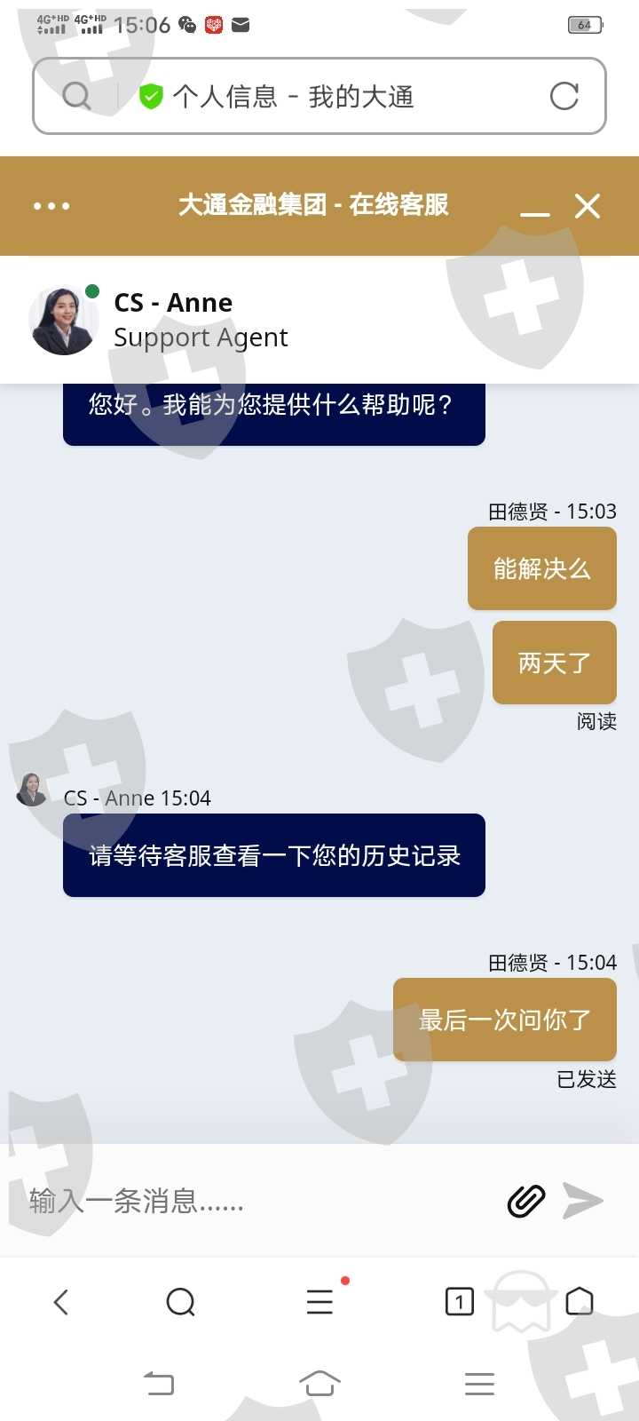 从十二月一号晚上,公司平台强平单子,到现在整整十天了,客户经理,跑人不回话,整天让客服人员用各种理由来推脱,就是把后台强平问题处理一下。赔偿问题十天了,整天就是各种理由推脱,就是不给赔偿,联系他们以前的客户经理,他们也劝我别在这里操作了,说已经不是以前的大通了。现在就是一个纯骗子公司