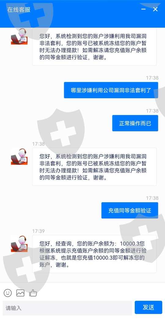 提现出金拒绝,提示账户疑似非法获利套现,已经被被冻结。如需提现需要充值同等余额解除冻结。用户未充值,第二天发现账户被清空余额归零。