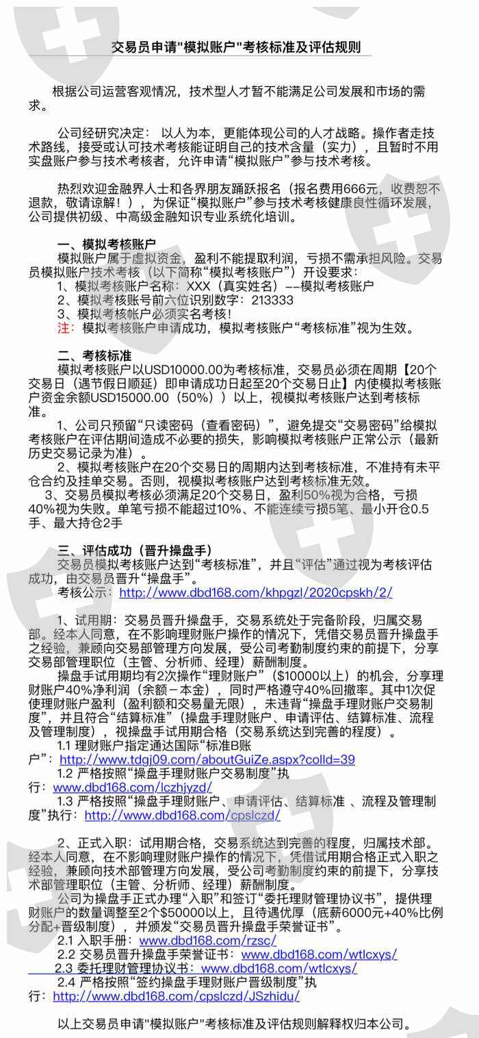 考核标准1:面试者经过培训后,参与开户5千或者1万美金的账户进行实盘考核,需要缴纳10%的质押金。30天内盈利30%为考核通过,盈利部分3/7分成,如亏损状态需要20%以上,将扣出质押金。