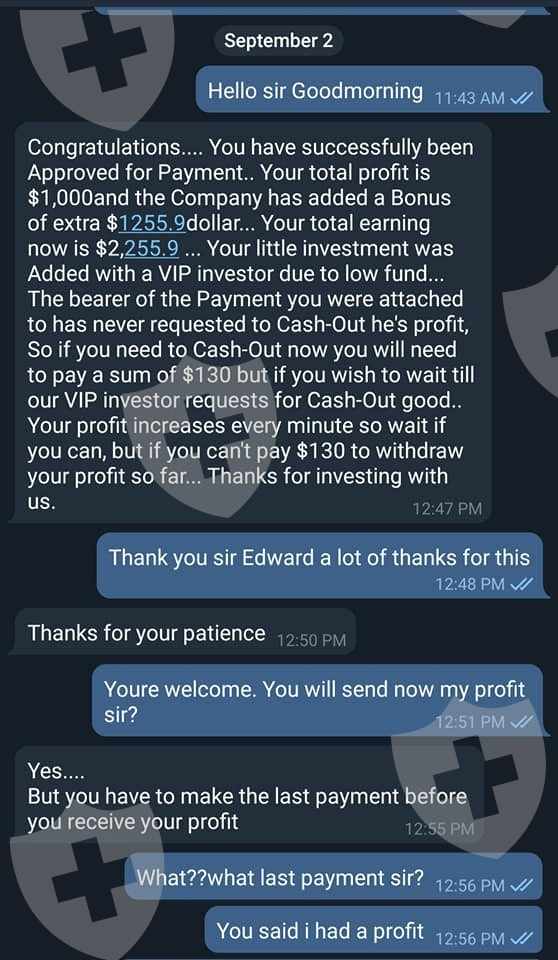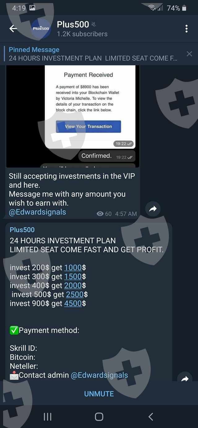 你好,不要相信这两个在telegram上伪装春成Plus500管理员的人。他们两个都是骗子。请分享和提醒所有人。他们假装是专业交易员,也假装有真正的交易计划。我被他们俩骗了。小心注意。谢谢