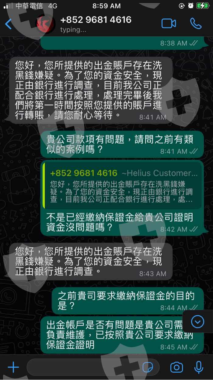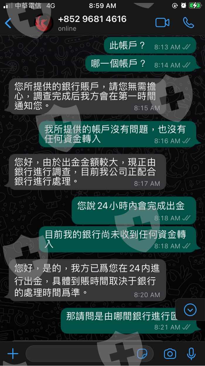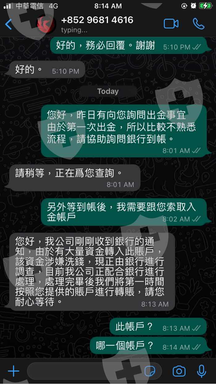 一開始提出出金申請,平台要求要繳納香港稅務,若延遲繳納會產生滯納金,之後又告知我的帳戶有洗黑錢嫌疑要求繳納保證金,繳納完成後又說出金需要出金手續費,繳完之後又告訴由於出金者眾多,若急須可以申請加急費用…等繳完之後等待出金期間,當初帶我入此平台交易的人開始已忙碌為由不接不回訊息,經查詢是空號。現在此平台卻以銀行攔截資金轉入,洗錢之嫌疑告知需要再等待…資金涉嫌洗錢與帳戶存在風險是無關連的,請注意!也請問各位遇到這種情況該如何討回被騙的錢呢?