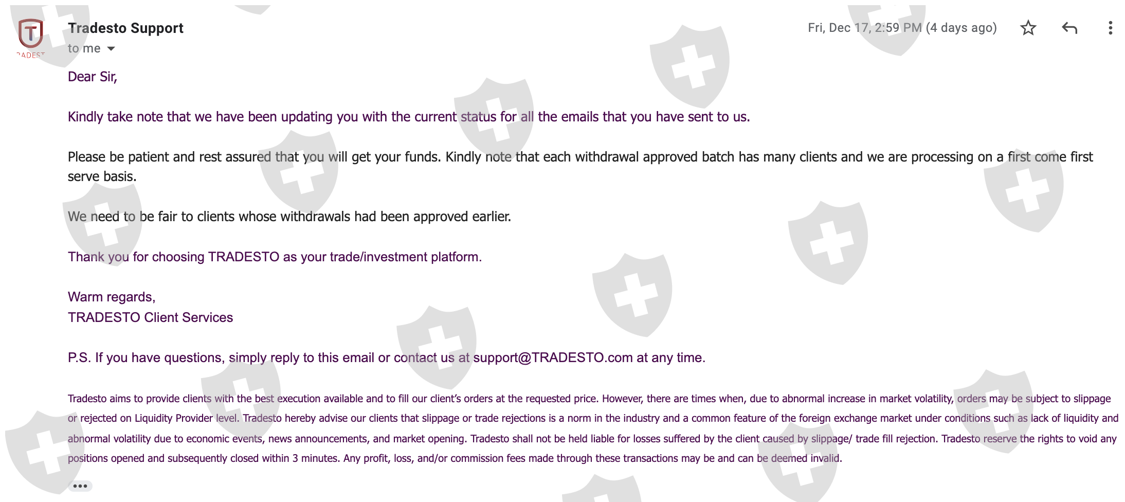 Withdraw about 1 month ago, I contacted the customer support but reply me with meaningless reply. They don't give a timeline for the withdrawal. Tradesto confirm is the scam. If anyone can help to get back, I don't mind to give some tips. The best is let them shut down and get sue.