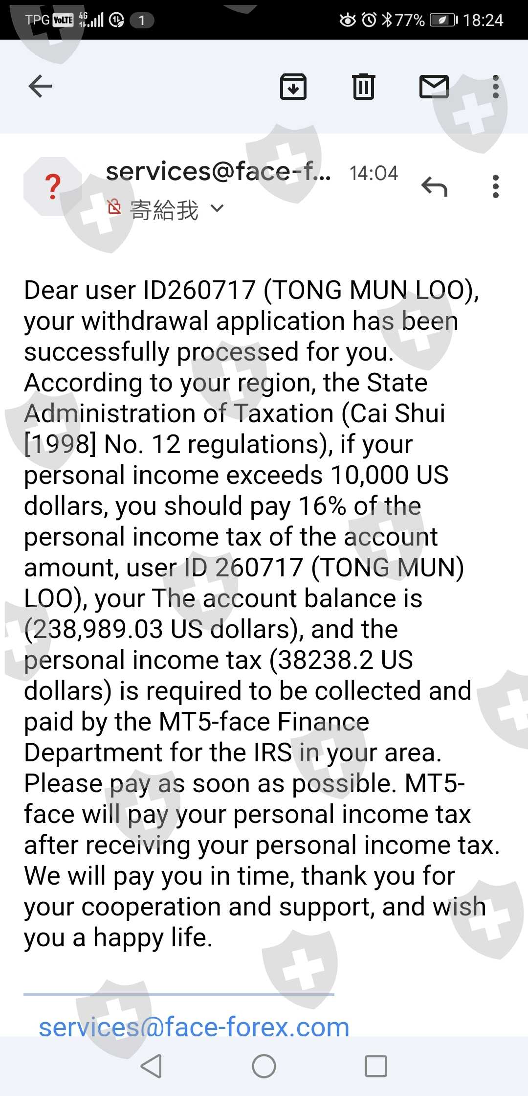 搞不明白也搞不清楚 我要出金的时候平台给我发了邮件说我必须缴税款项35238.2美金才能出金