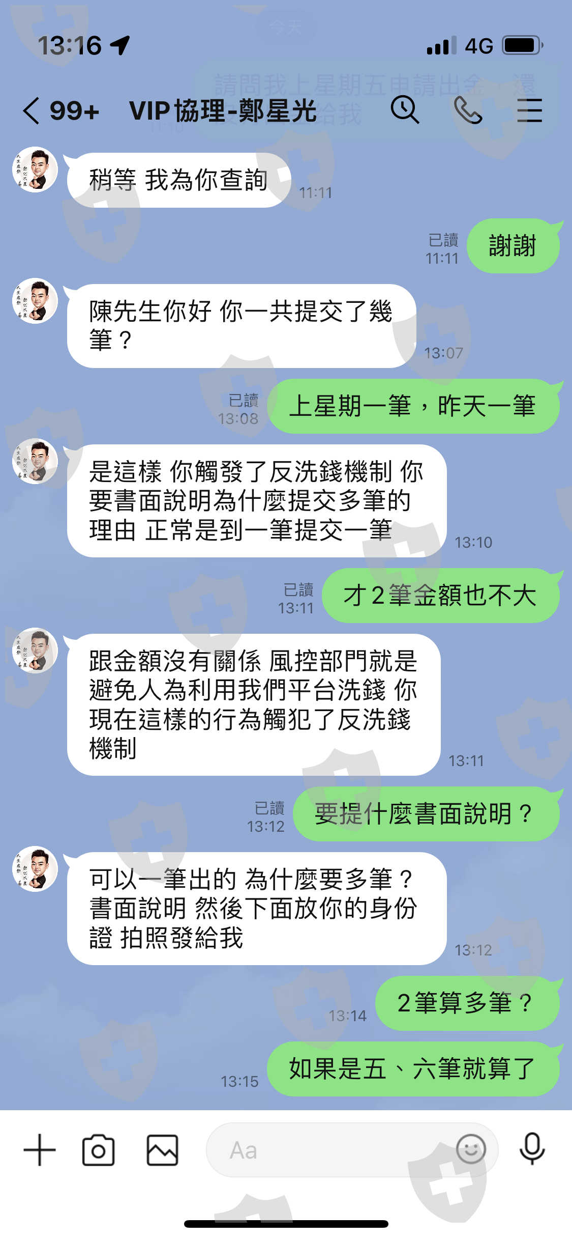 無法出金,上星期提交一筆出金,一直無法出金直到這星期在提交一筆出金,說什麼反洗錢機制,根本就是無法出金