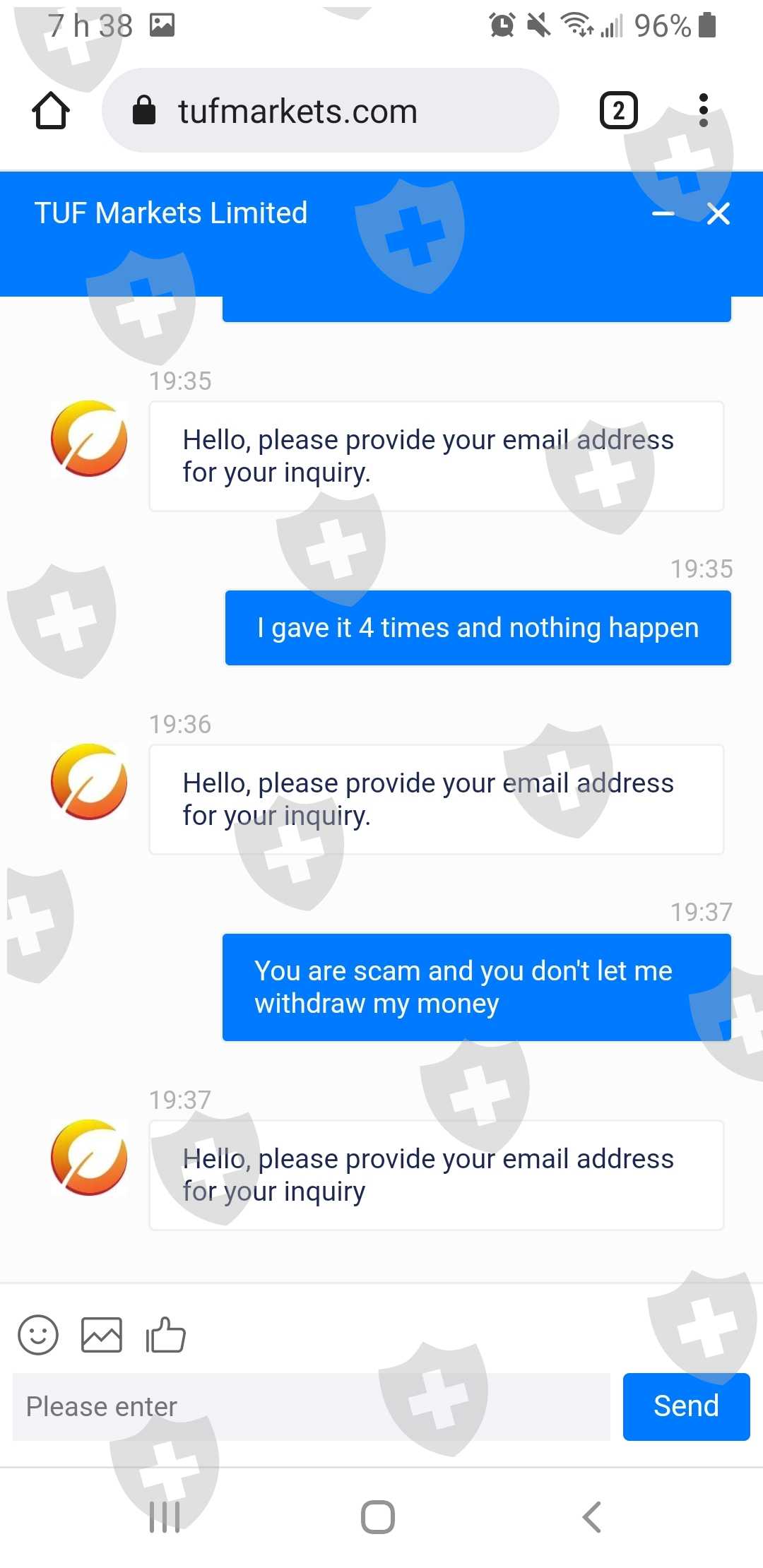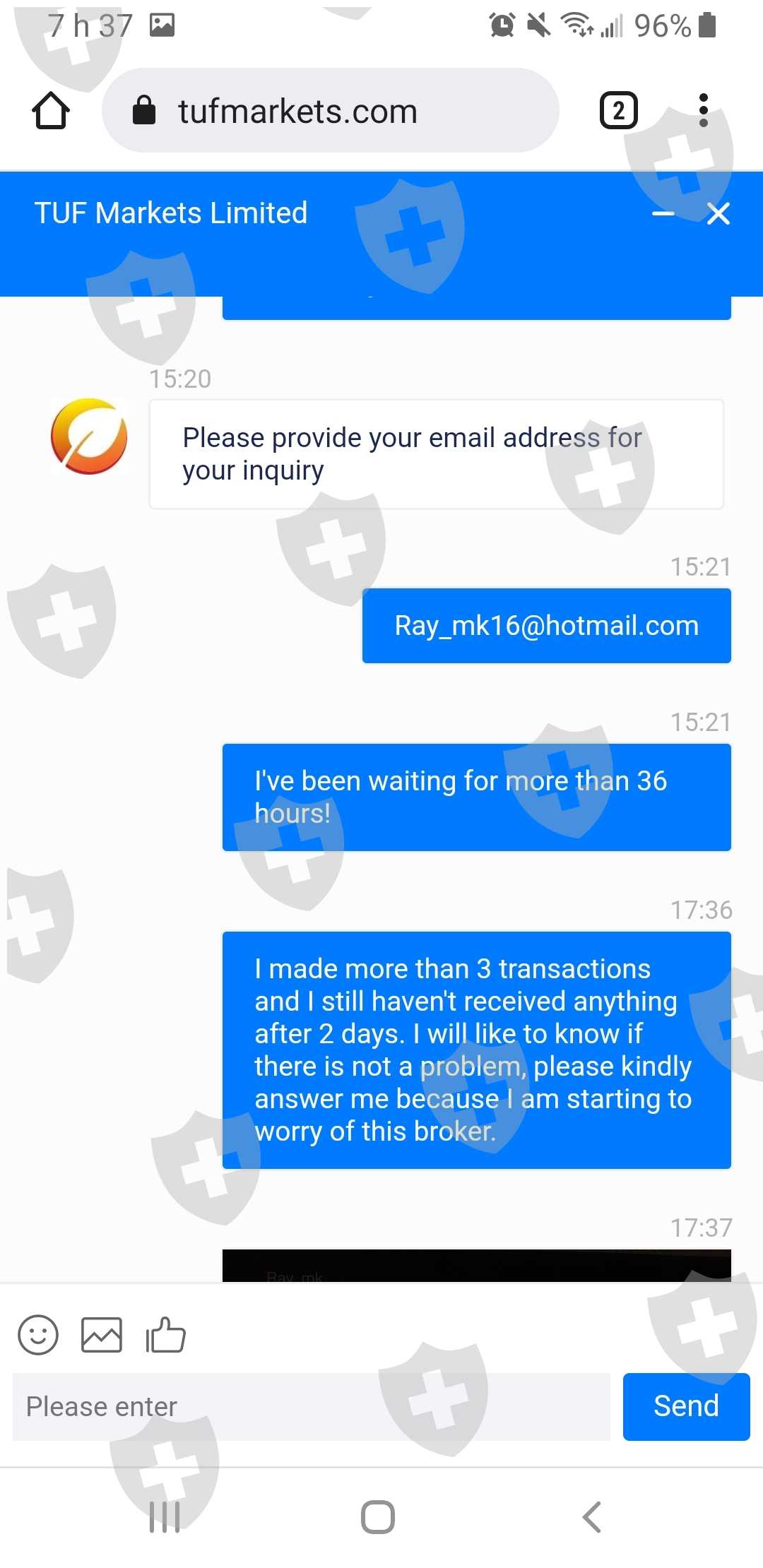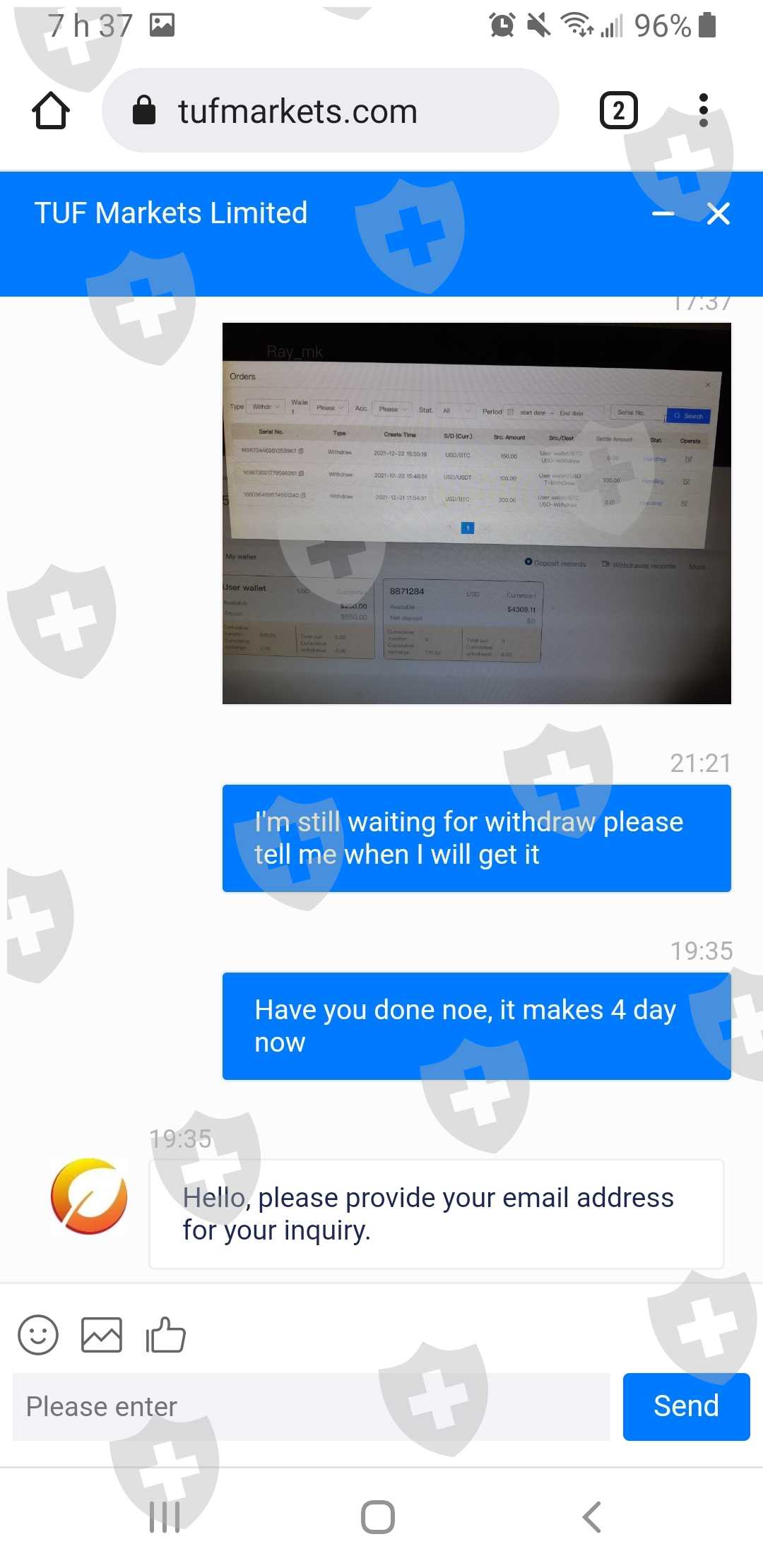 在完成我的帐户并产生利润后,我决定出金这笔钱。我询问出金步骤,他向我解释说。一旦交易结束,我的资金会被冻结,他们告诉我能够发送到我的btc地址是正常的。我等了12个小时,我的 btc 钱包仍然没有收到任何东西。我要求解释,他问我要我的电子邮件然后我等待了更长时间。 3-4 天后,我发了几条消息,但没有回复。最后,消息是自动回复的