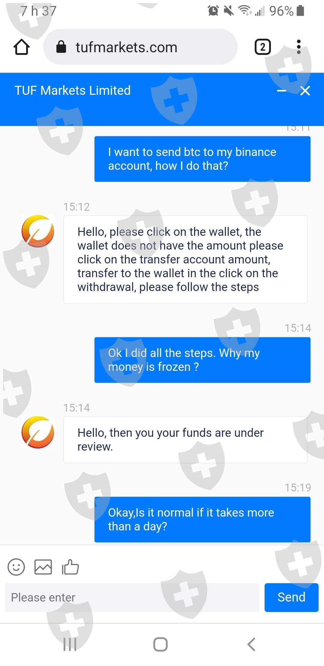 After making my account and generating profits, I decided to withdraw this money. I ask for the procedures and he explains them to me. Once the transcation ends, my funds are frozen and they tell me that it is normal to be able to themsent to my btc address. I'm waiting 12h and still nothing received in my btc wallet. I ask for explanations and he asks me for my email and to wait longer. after 3-4 days I send several messages and without answers. Finally, the messages are automated
