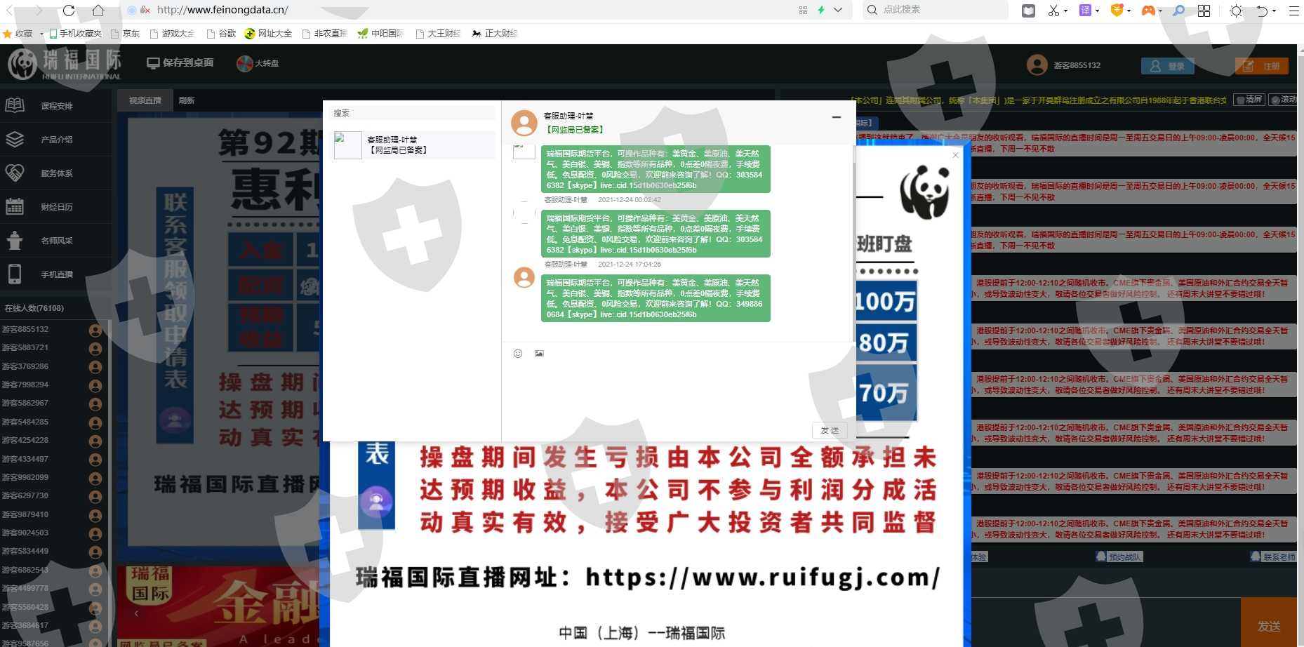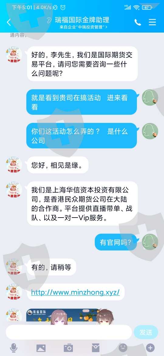 连网址都没变,只是改了直播间名字。以前叫中阳期货,操作平台叫华辰国际投资,现在直播间改名叫瑞福国际,民众期货投资,千万别去入金操作,不然就洗白