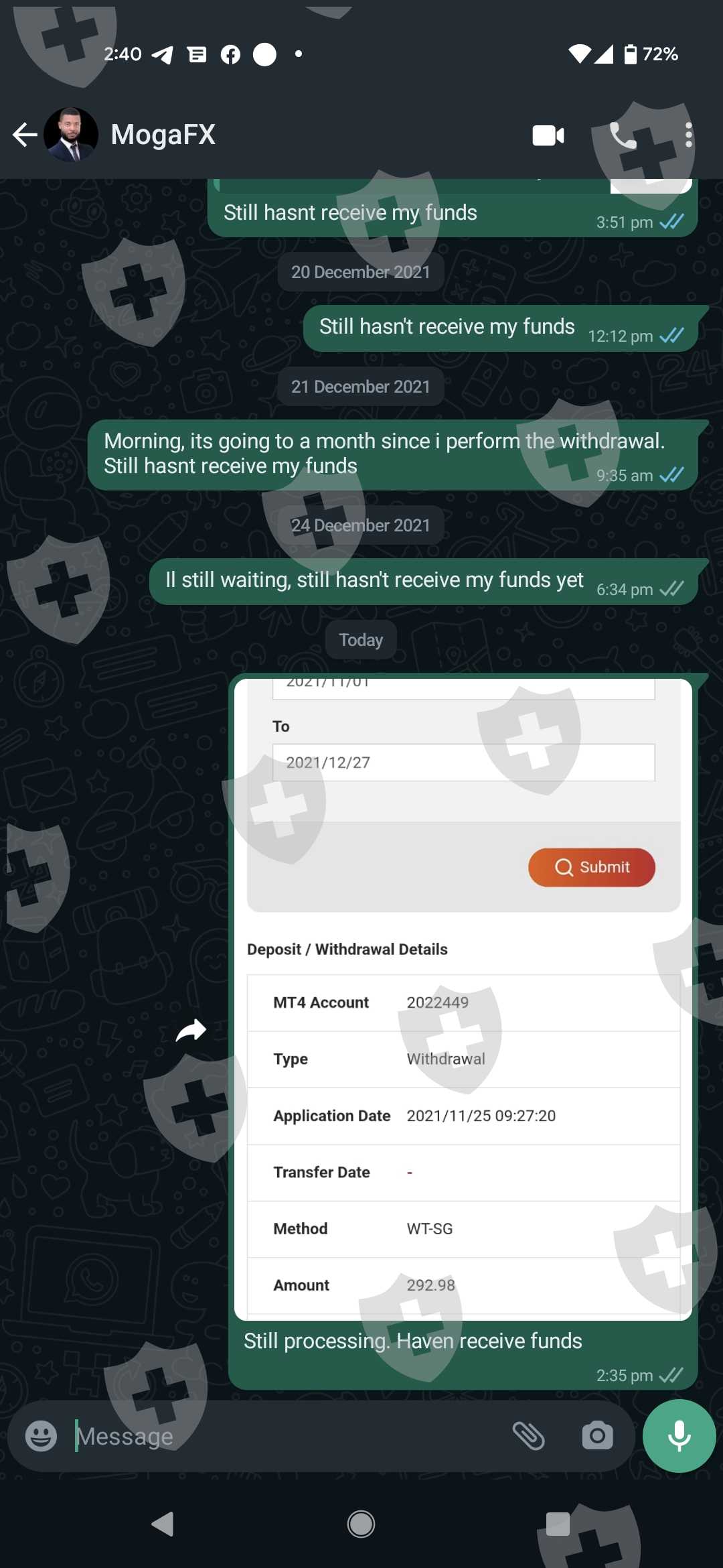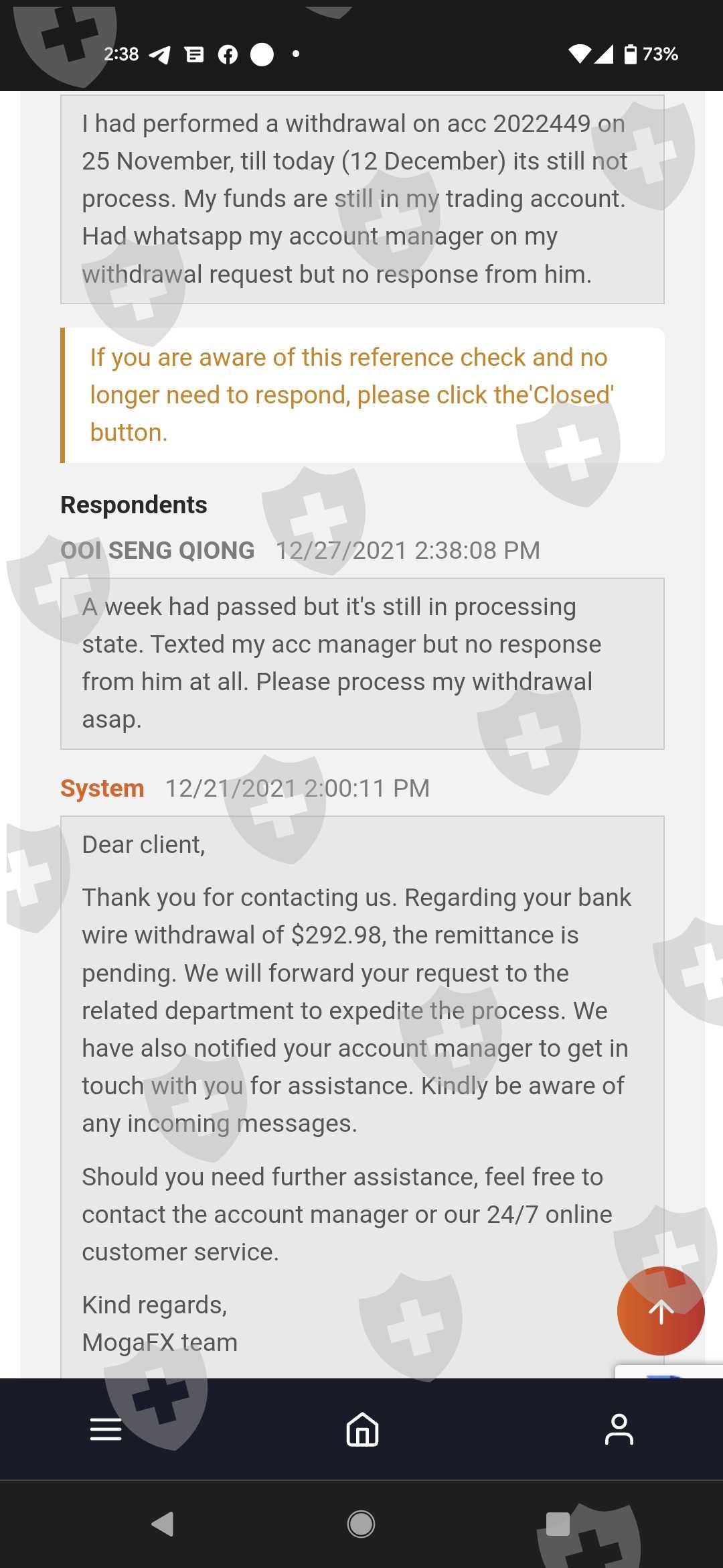 我在11月25日进行了提款,但直到今天我也没有拿到资金。服务台将责任推给客户经理,但客户经理没有回应。 WhatsApp中的蓝色勾号不见了,怀疑是客户经理屏蔽了我。