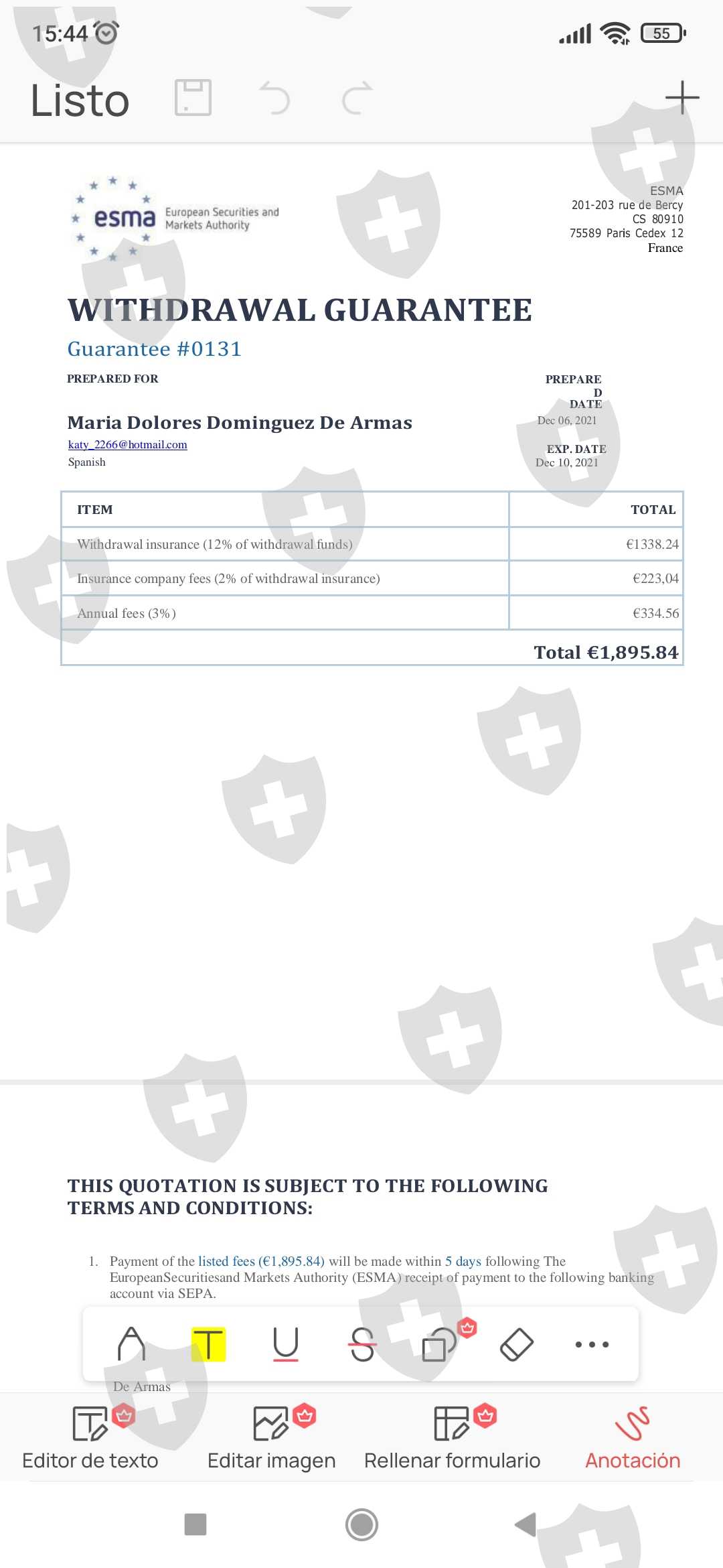 这些是成熟的骗子,他们还发送虚假的 SEPA 文件,并且 ESMAS 是虚假的,他们骗了我投资的 4000 欧元,并保留了我的 11,152 欧元提款