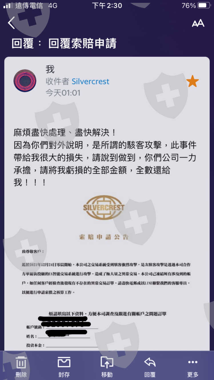 12/29 silvercrest 交易商發出電郵,說 可以填寫申請索賠,但!填寫完畢,回傳後竟然收到郵件退回通知⋯⋯silvercrest 交易商是真的有心要賠償嗎?????