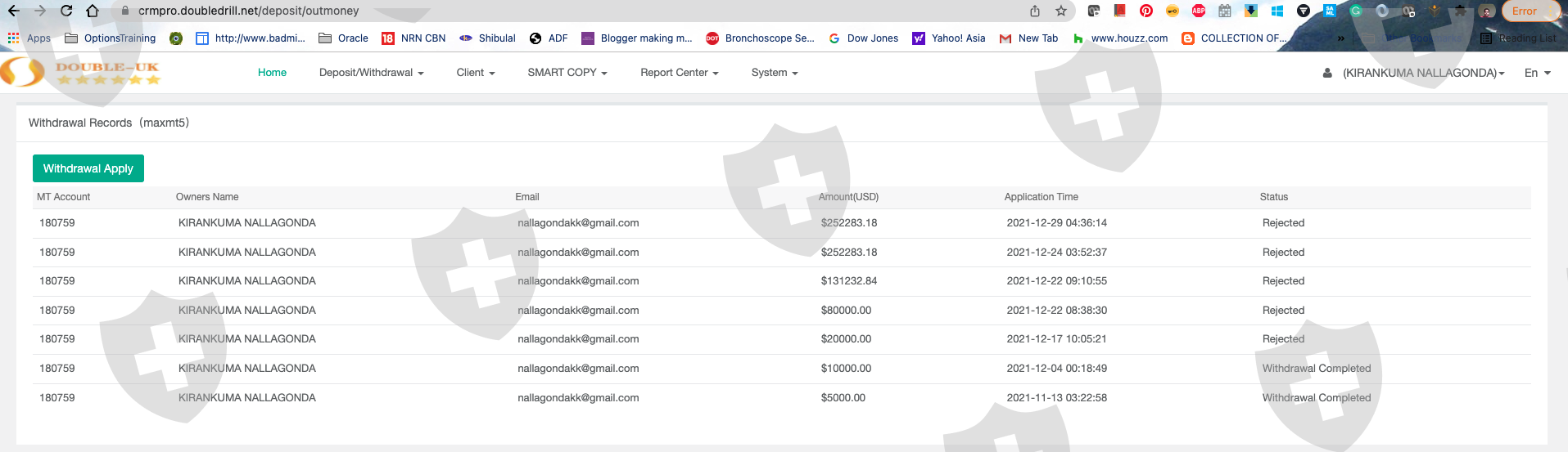 以下是DoubleDrill的回复:经系统查询,由于您的账户存在多笔非法交易,涉嫌恶意套利我司资金。并且多次提交提现,因为您的提现地址异常,导致收款人的多个账户被冻结。经有关部门研究决定,您的180759账户不合法,涉嫌洗钱。现在您的账户180759被永久冻结。为了防止您的账户资金出现任何损失,客服建议您在Double Diamond重新创建一个新的MT5账户。将现有账户180759的资金转入新的MT5账户,需在转账过程中支付账户金额(US$302,892.83)的5%(US$15,144.64)的服务费,并需存入180759账户余额在新账户中存入 20%(60578.56 美元)的保证金。 (质押存款是您新账户中的存款,作为担保。)在您完成支付后,180759账户资金将转入您最新的MT5账户。当您将所有资金从 180759 账户转移到新账户时。您的 180759 帐户将被取消。您可以从新账户中提取您需要提取的资金。请您尽快介入解决问题