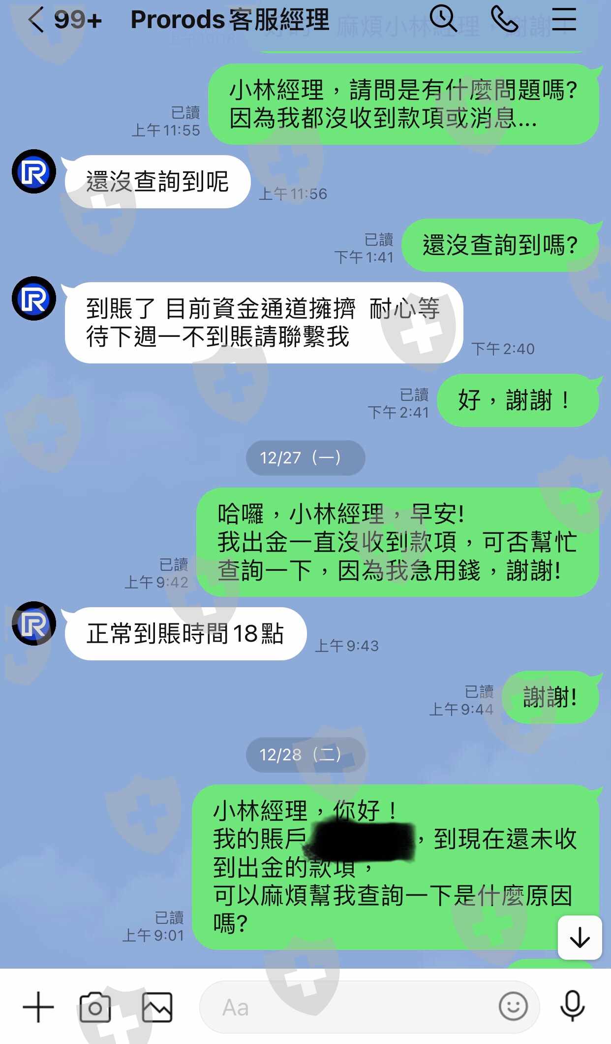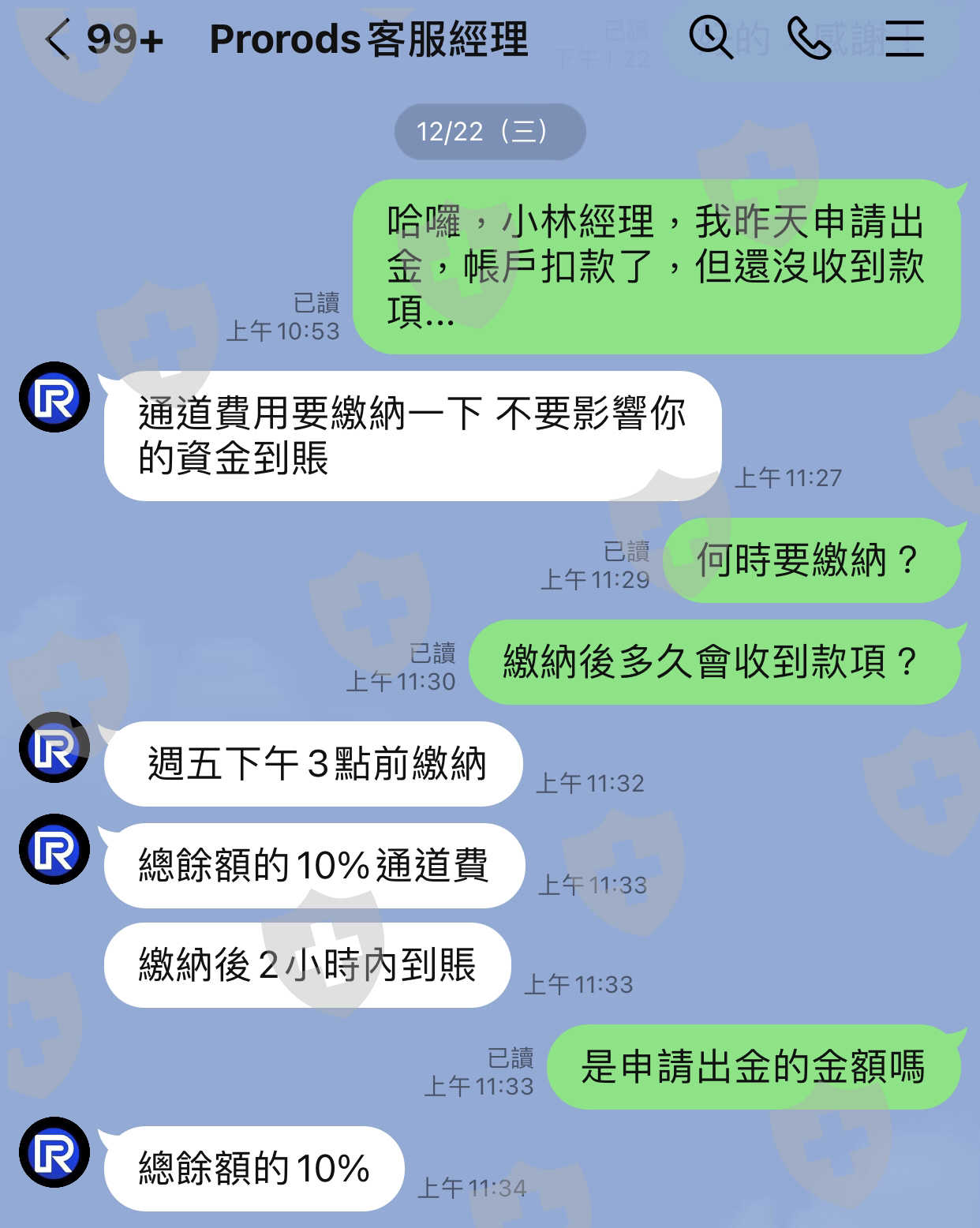 剛開始透過line認識ㄧ名女子,說外匯可以賺取股市的損失,便邀我入群組,剛開始群內有位自稱prorods的客服經理說,prorods是有監管的也教大家如何去查詢,剛開始接觸小額出金都很正常,都是T+1天,直到2021/12/21申請大額出金,就開始異常了⋯⋯群組的社長就說跟平台的通道合作到期了,要我們繳納10%的通道費並全部申請出金⋯