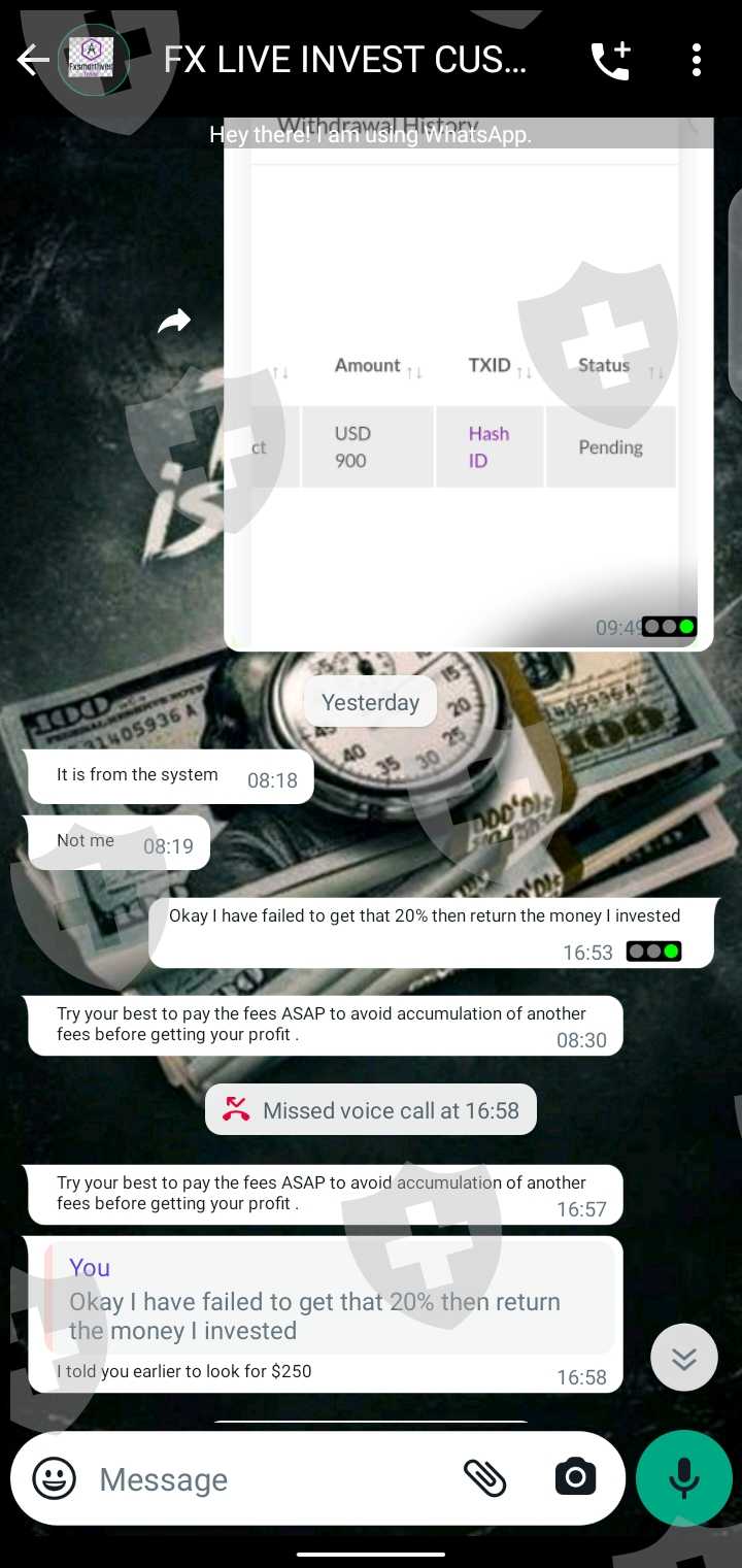 我将钱投资到fxsmartlive贸易公司,投资需要 7 天才能获得利润,然后在7天后它不让我提款,他们想让我再次投资,现在他们删除了我的提款记录
