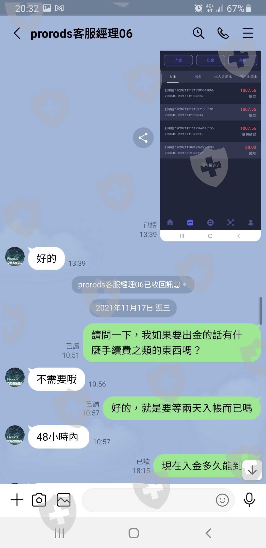 因為對軟體平台的不了解,加了客服詢問出入金詳細狀況【客服表示出金僅需要48小時就能到帳】入1000美金操作幾天後,嘗試出金200美元,確定可以出金就加大投資到15000美元,中間自己操作有賺4000多美金,想說過年快到了加上有朋友在另外的交易平台,我想說跳過去好了所以大筆出金,結果等了好幾天一直都沒有入帳。