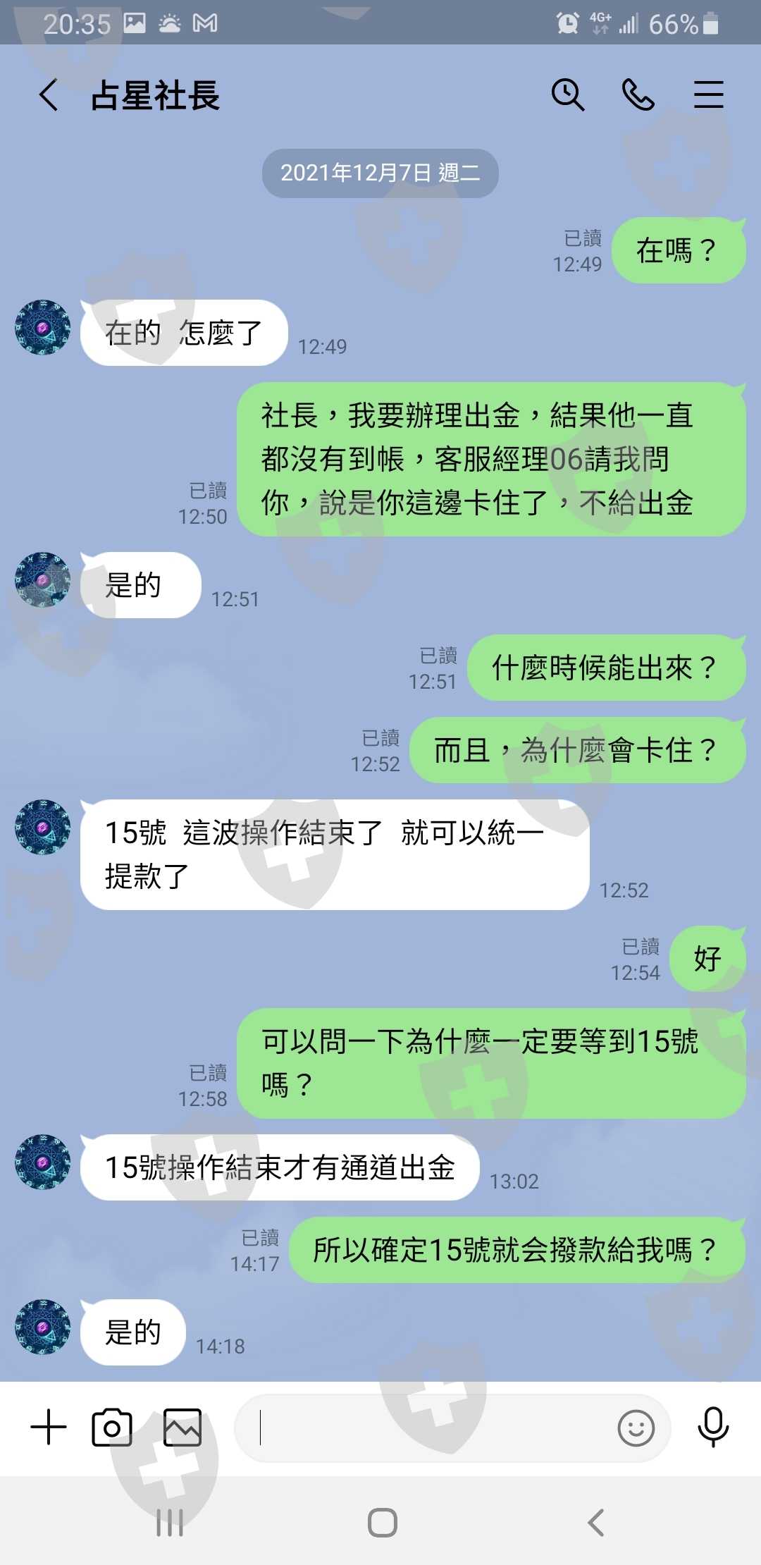 問飆股社長,社長說是他卡我錢沒錯,統一12月15號出金,到時候聯繫他的助理。