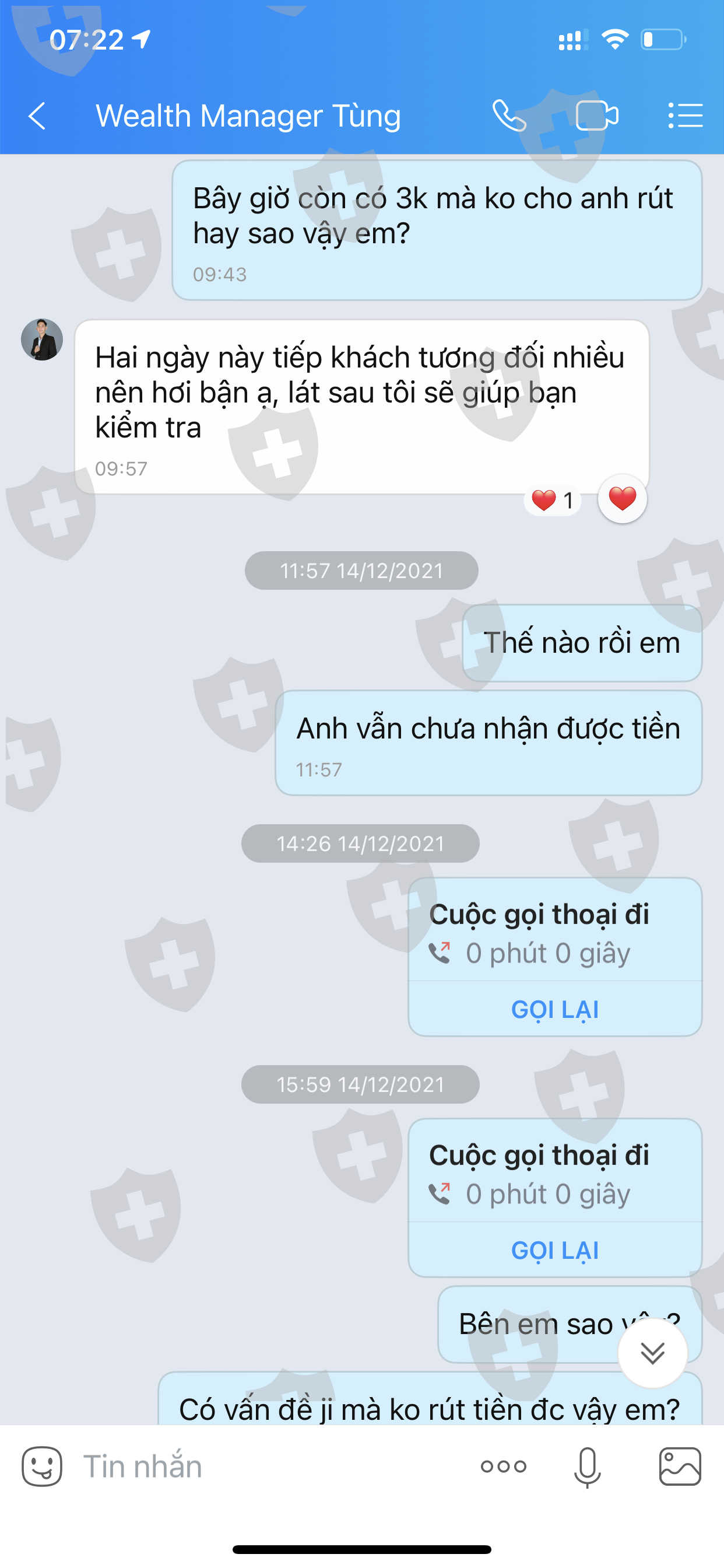 Sàn lừa đảo tự giao dịch thua lỗ và không cho rút số tiền còn lại. Nhân viên tự giao dịch thua lỗ dẫn đến cháy tài khoản của tôi gần 76.618 đô la và bây giờ tôi cũng không thể rút được số tiền còn lại hơn 3.109 đô la. Tôi làm lệnh rút tiền từ ngày 12/12/2021 đến nay vẫn chưa nhận được tiền. Tôi liên hệ bạn chăm sóc khách hàng tự giới thiệu là chuyên viên quản lý của sàn nhưng rất nhiều lần vẫn không trả lời. Yêu cầu sàn trả lại tiền cho tôi. Tôi sẽ đăng đến khi nào nhận lại được tiền của tôi.