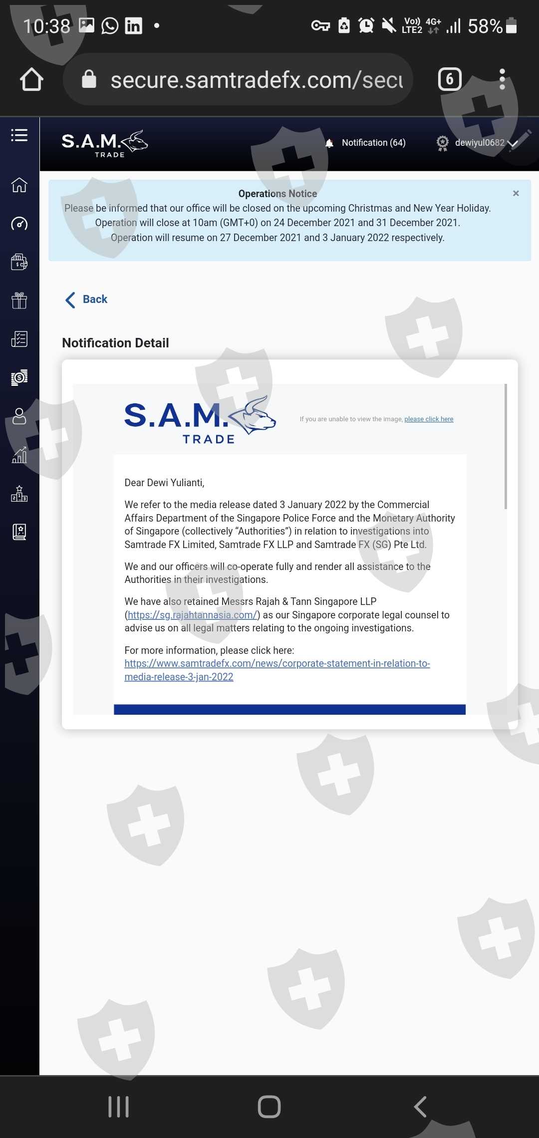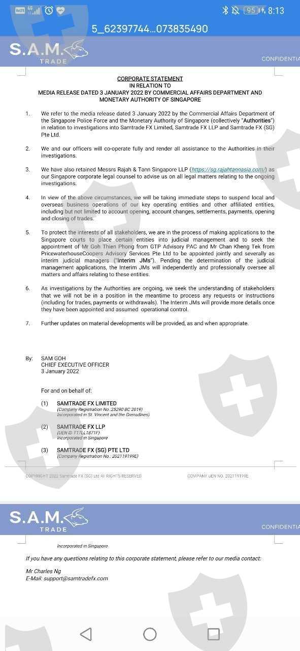 Referring to a media release dated 3 January 2022 by the Commercial Affairs Department of the Singapore Police and the Singapore Monetary Authority (collectively the "Authorities") in connection with investigations into Samtrade FX Limited. Samtrade FX LLP and Samtrade FX (SG) PteLtd.