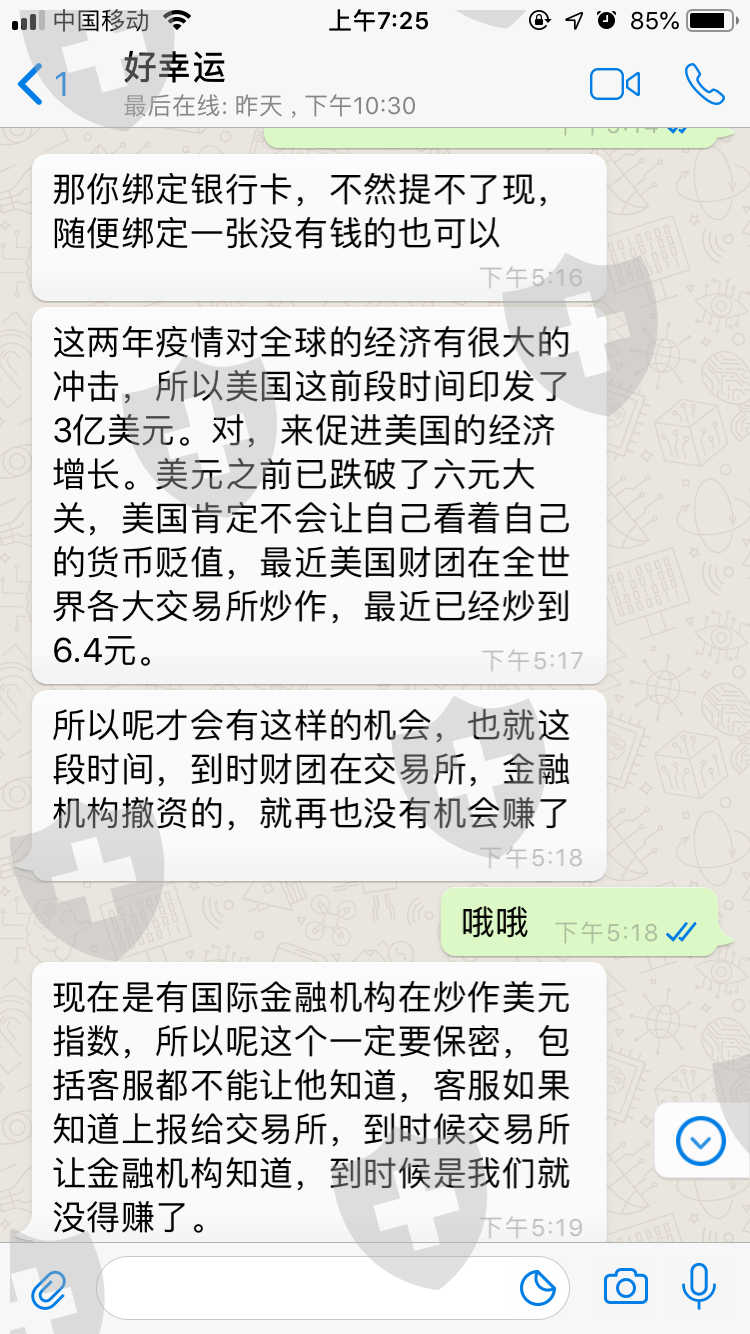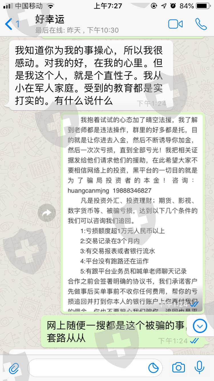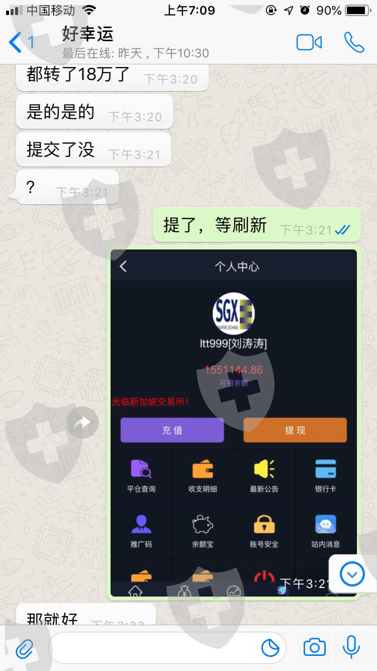 珍爱网上认识的一个征婚对象,打着要以结婚为目的加了微信,说在新加坡交易所工作,亚洲排名第五的交易所,然后让我下载一个国外软件,方便语音沟通,后面说他在公司内部得到一个外汇购买的内幕消息,让我帮他操作购买,开始我怕他是洗钱,怕他骗我,让他把身份证给我证明他没有干违法的事,后面又诱惑我购买外汇,我不想那个,他说他给我充值1000元,让我自己想赚再自己考虑,这一周之内让我帮他操作了300多万的外汇,中间因为不敢相信他,吵了几次,他都利用他在那里上班,说他军人家庭出身,就打消我的顾虑,最后我害怕,试着充值了10000元,提现3000元成功够,又充了5000元,心里还是担心,后面再试着提现时,就被卡住了,申请提现成功,但是到不了帐,客服说要充值黄金会员才可以,查了网上的一些消息,不敢再往下充值,想曝光他们的行为,这个所谓的公平,内幕,应该是想诱导我下单购买外汇,甚至中间他还蛊惑我贷款充值。他的账号最后加上盈利400多万提现成功了,我求他把我账号充值会员,把钱提取出来,他就不回信息了。