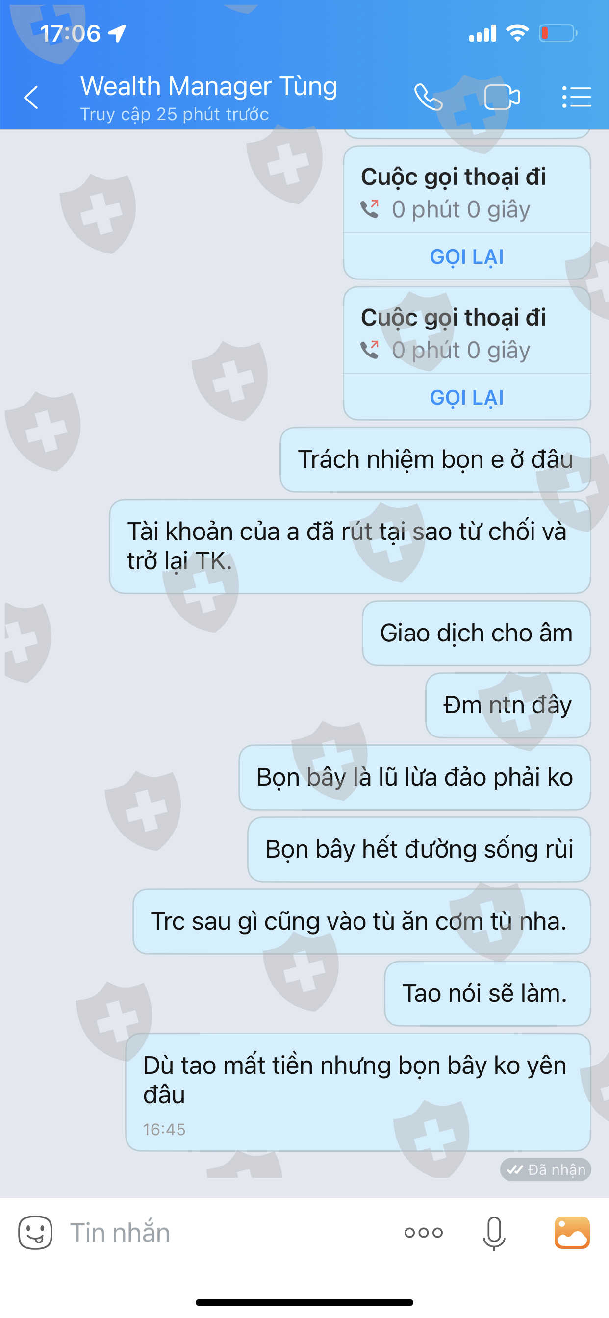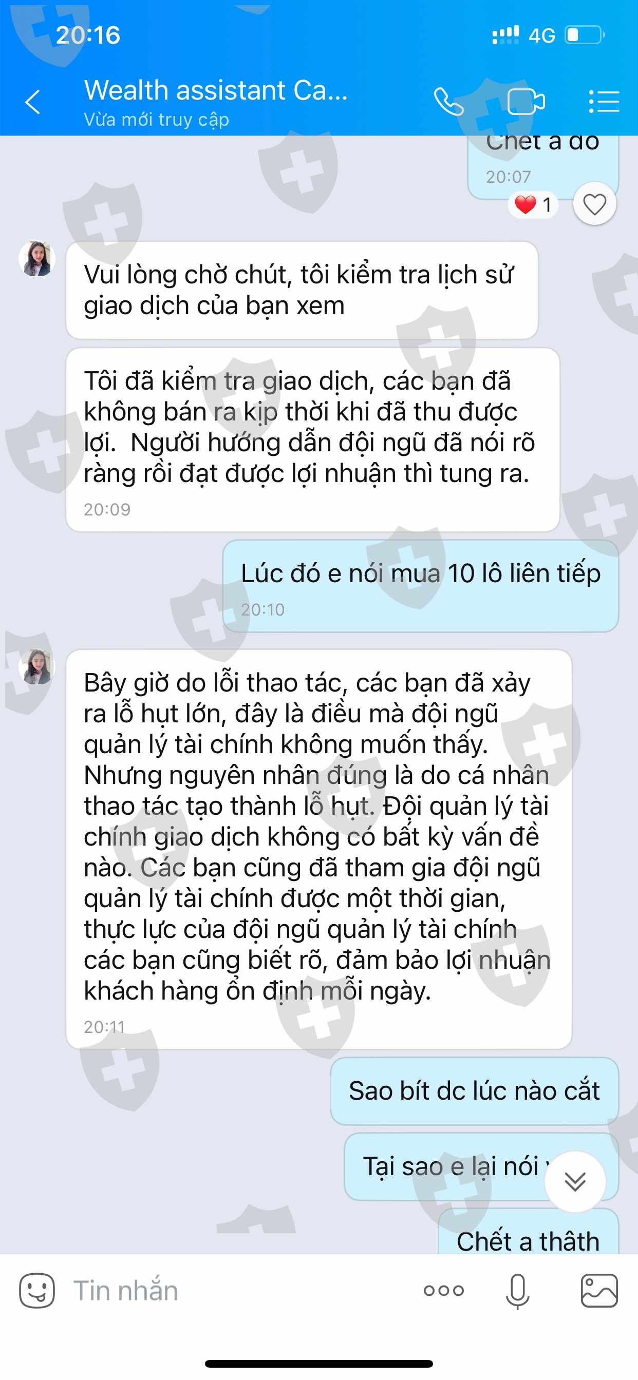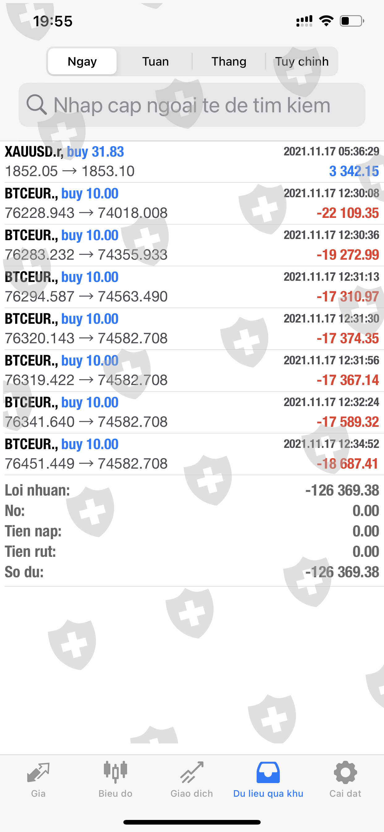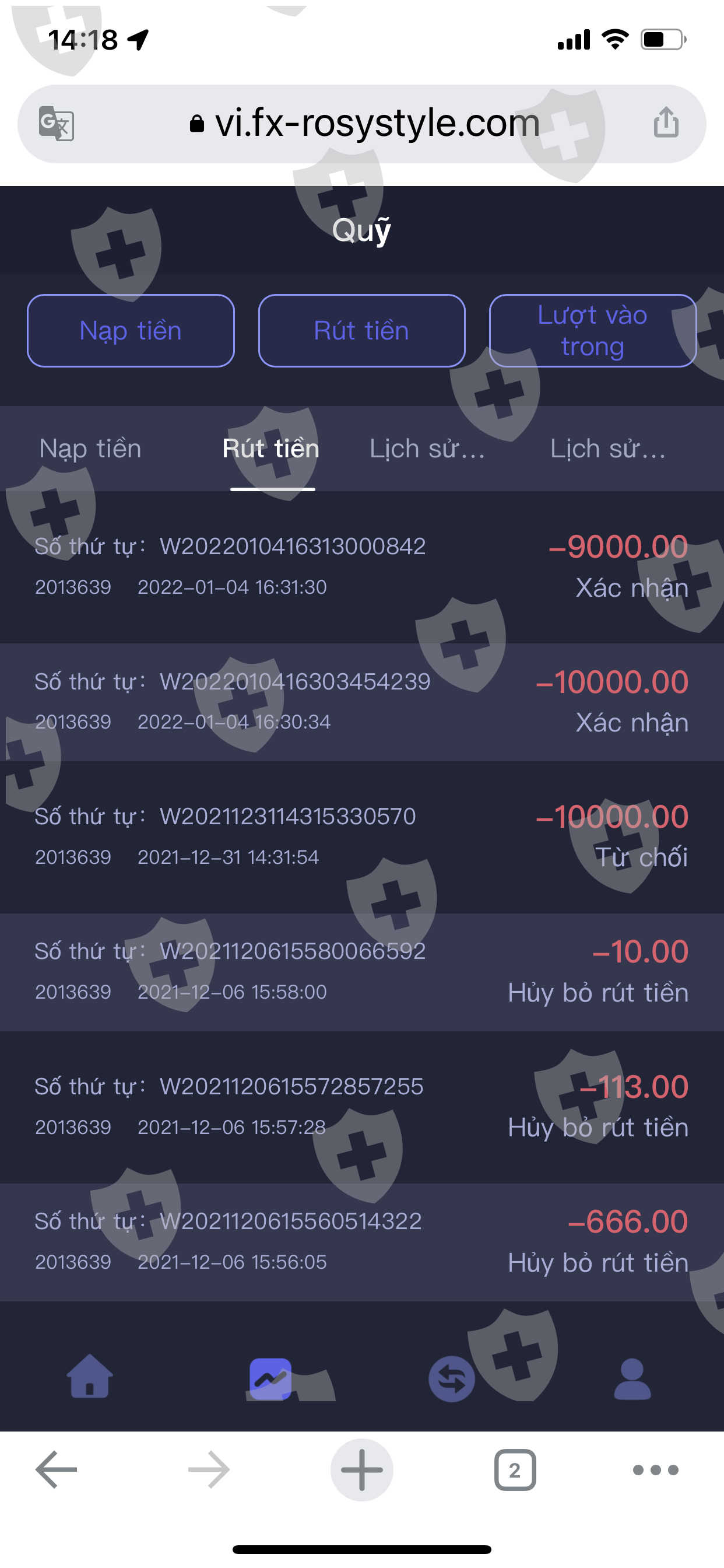 Sàn lừa đảo tự giao dịch thua lỗ và không cho rút số tiền còn lại. Nhân viên tự giao dịch thua lỗ dẫn đến cháy tài khoản của tôi gần 103.000 đô la và bây giờ tôi cũng không thể rút được số tiền còn lại hơn 19.336đô la. Tôi làm lệnh rút tiền từ ngày 31/12/2011 đến 6/01/2022nay vẫn chưa nhận được tiền. Và tiền rutd của tôi tự động nọp lại và tự giao dịch làm cháy tài khoảng tôi lần nữa số tiền lên 122.336 usd. Tôi liên hệ bạn chăm sóc khách hàng tự giới thiệu là chuyên viên quản lý của sàn nhưng