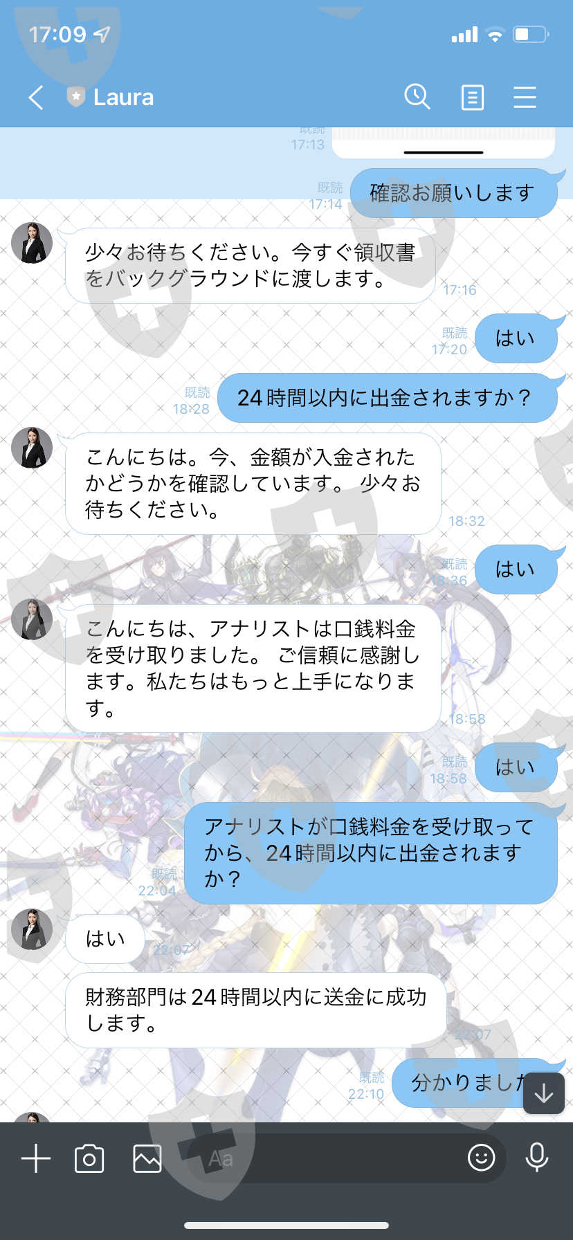 我申请了提款,把钱转到了 185006 日元,并联系了分析师收取了费用,但 24 小时还没有到我的银行账户。你被支持经理愚弄了吗?