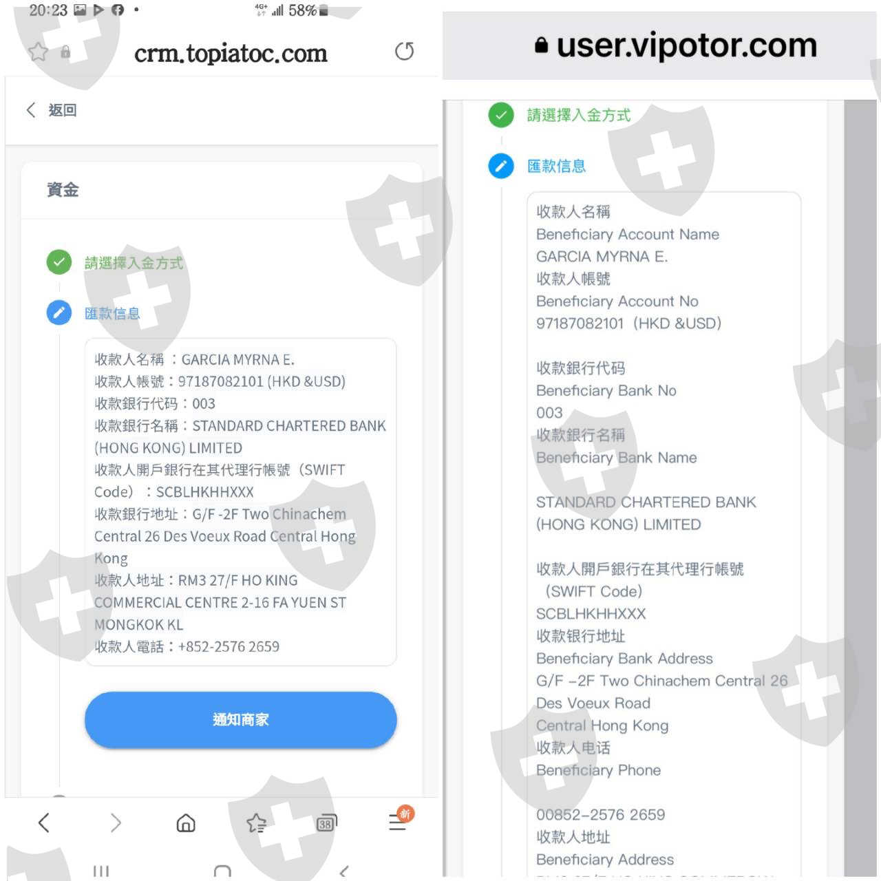我們被詐騙的受害者經過每天的調查。在昨天發現這兩間公司都是同一個詐騙集團,證據如下:一開始Vipotor 的國際電匯入金帳號是香港渣打銀行的帳號35486005011,受款人名稱為HO CHAU YUET,經過我向台灣高雄警局報案說明後,昨天他才更新帳號,但這個帳號與Topiato 平台竟變的一模一樣,帳號名稱電話地址。收款人名稱 :GARCIA MYRNA E.