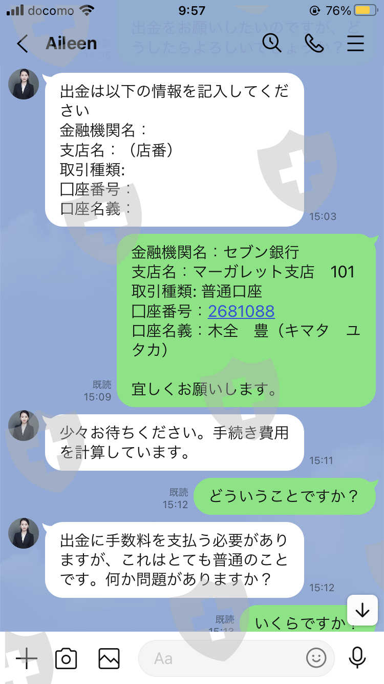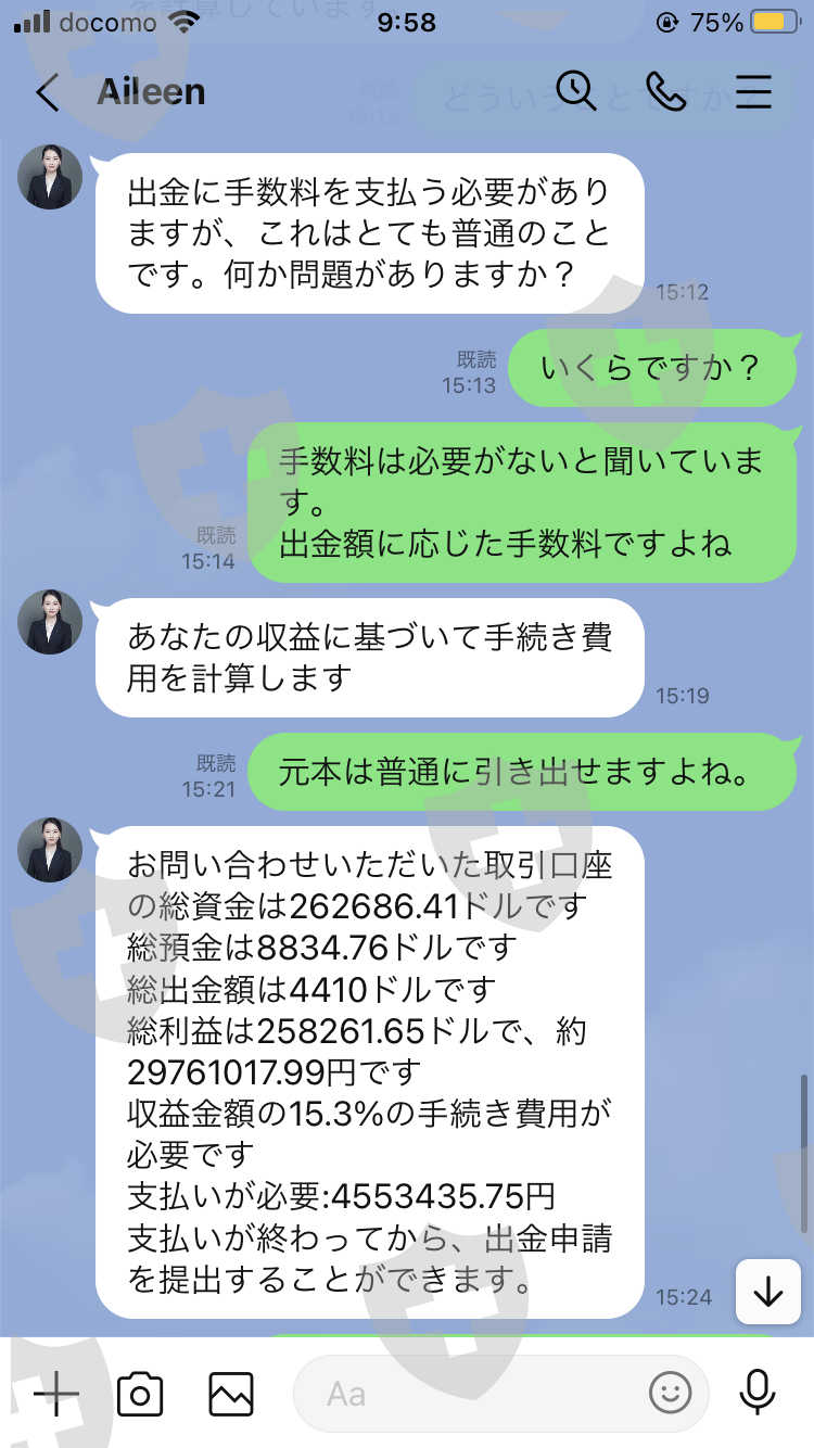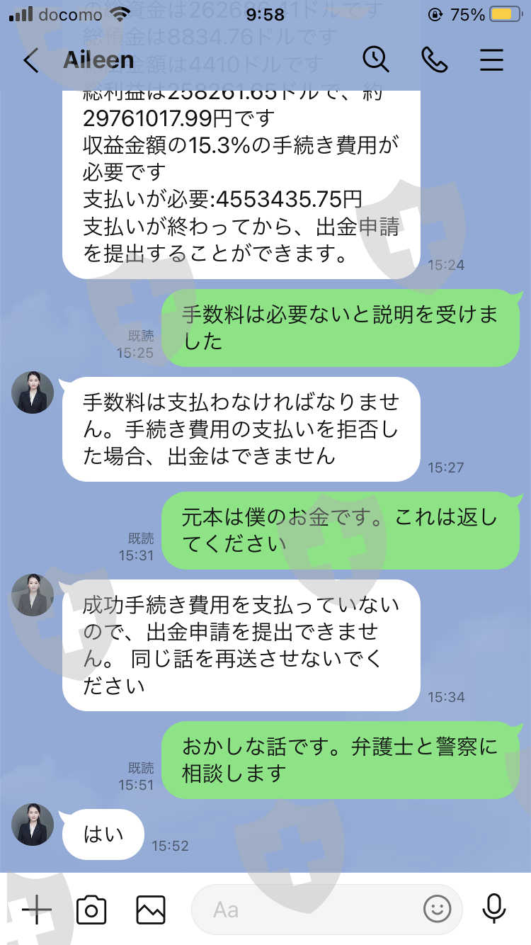 1月11日に25万円の入金をしたあと、出勤申請をしようとしたところ、追加で手数料が必要だと言われ、450万円以上の法外な金額を請求されました。