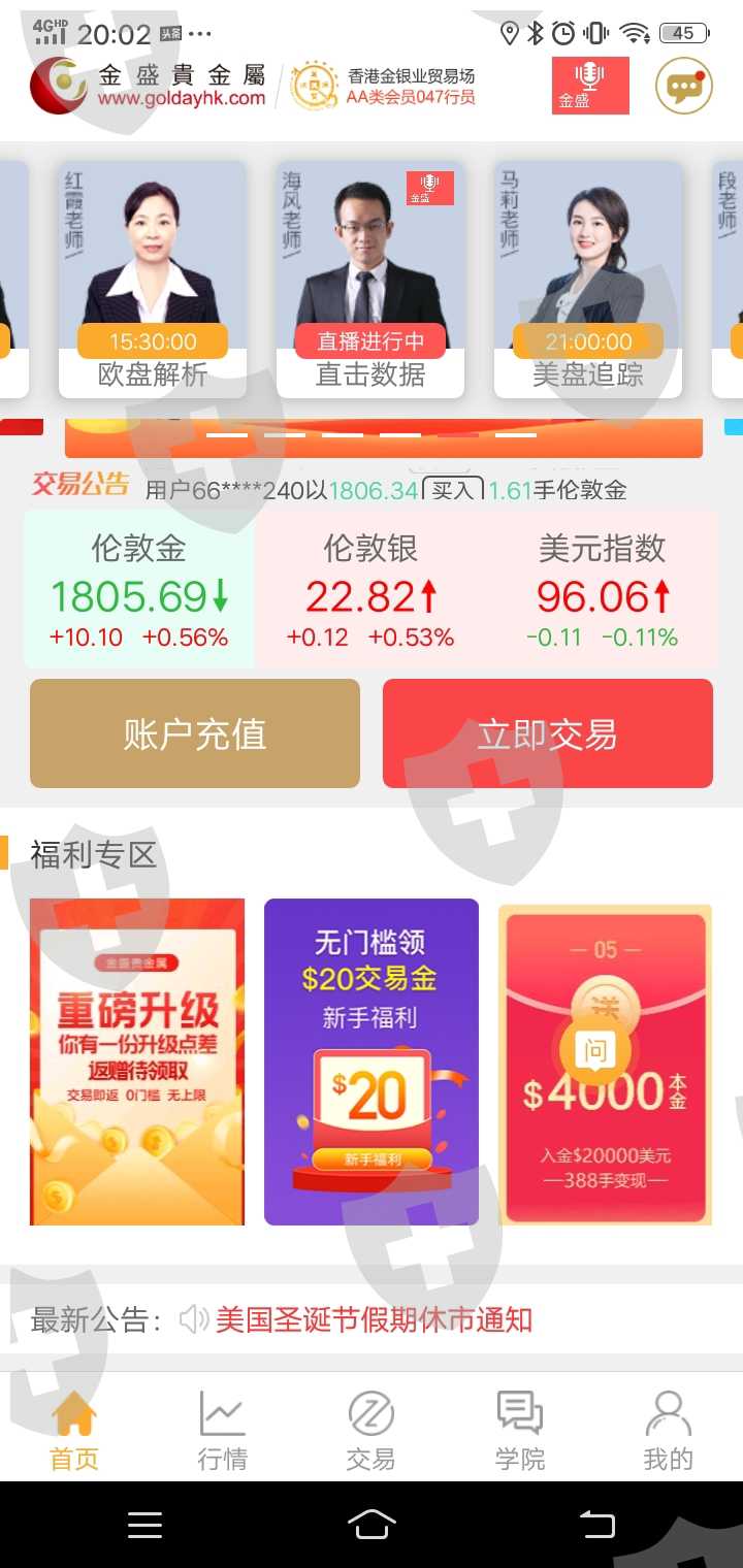 本人汪波在一qq好友推荐下在11月金盛贵金属公司开户账户 86817212 ,金盛贵金属公司旗下app盛盈金投里面有直播老师在推荐做单,在跟单一个月里发现金盛贵金属 app里面这些老师是在乱推荐,在出现亏损以后让你不断充值保证金,在爆仓以后又诱导客户继续充值,说是国际行情不好变化太快了和他推荐没有关系,当初对金银交易不太懂才对app里面的老师比较信任,在老师推荐下不到2个星期左右就把充值的2000多美元就亏空了,金盛公司为了赚取点差在app里面让这些老师胡乱推荐让客户开单做仓来赚取点差