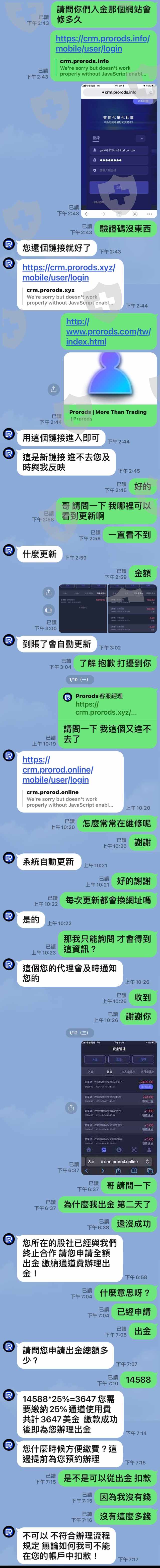 剛開始透過line認識名女子,說有飆股介紹,便邀我入群組了,因為有贈金活動,也有自稱Prorods的客服經理說Prorods是有監管的,也教大家如何去查詢,所以跟著操作,入金,出金。一開操作還順利,也不錯,但是遲遲沒有大額入金,和出金。結果被惡意引導操作大虧,請請我申請了信用金一萬美金,來翻盤,最後虧損剩下兩千美金,之後還一直打氣並幫忙,我也入金了一萬美金,並歸還了信用金,在沒多久也被從2000多操作到14000多,我想申請部分出金,結果通知與平台的通道合作到期了,需要繳納25%的通道費,並申請全額出金,但因為沒有這麼多現金,故請求幫忙部分出金和直接扣款,被拒絕後,目前都還沒有動作,直到今天發現有很多受害者仍有一樣狀況。還有受害者繳了通道費還是無法拿回本金!
