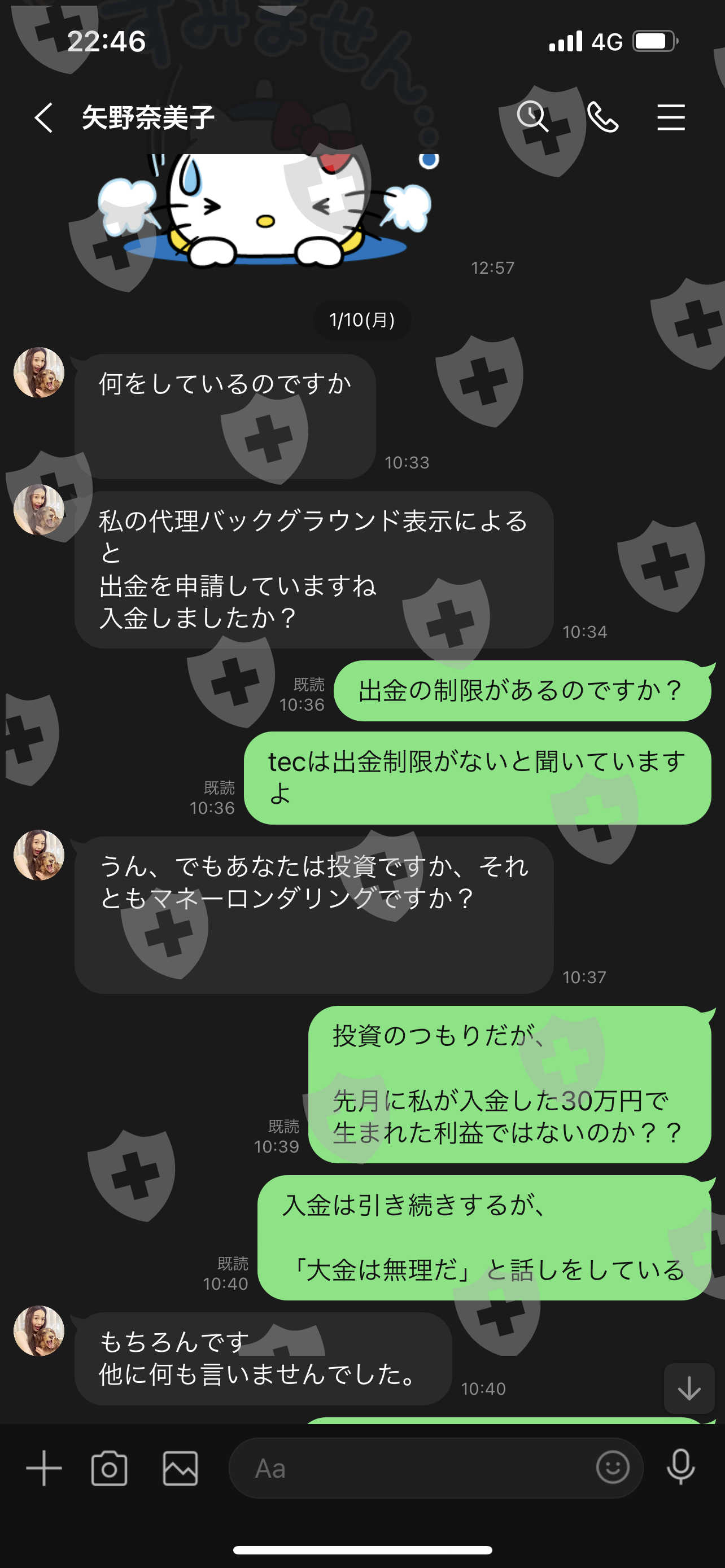 要求提取全部余额。和图片中的他一样,我开始和矢野奈美子交易,但我无法退出。矢野奈美子误导了解释,因为她从未收到有关条款和条件的解释。费用补助只是一种改造。最重要的是,可以从我的账户余额中扣除费用,但我不会。客户经理 Yuki Matsumiya 将成为同伴。 Namiko Yano 承认没有提款限制。