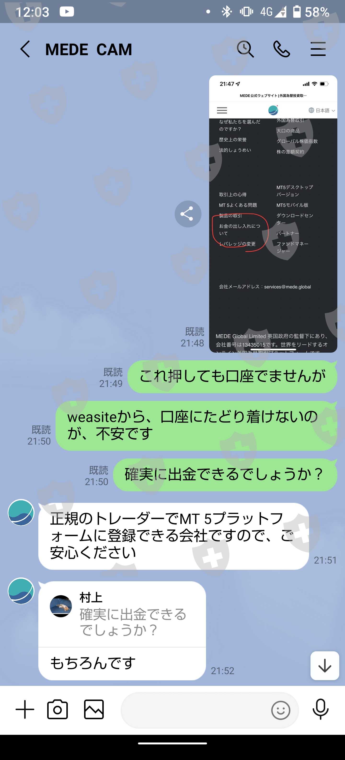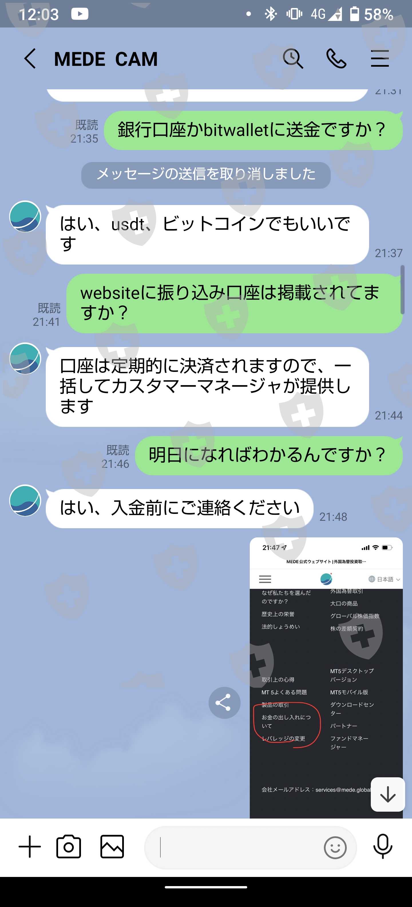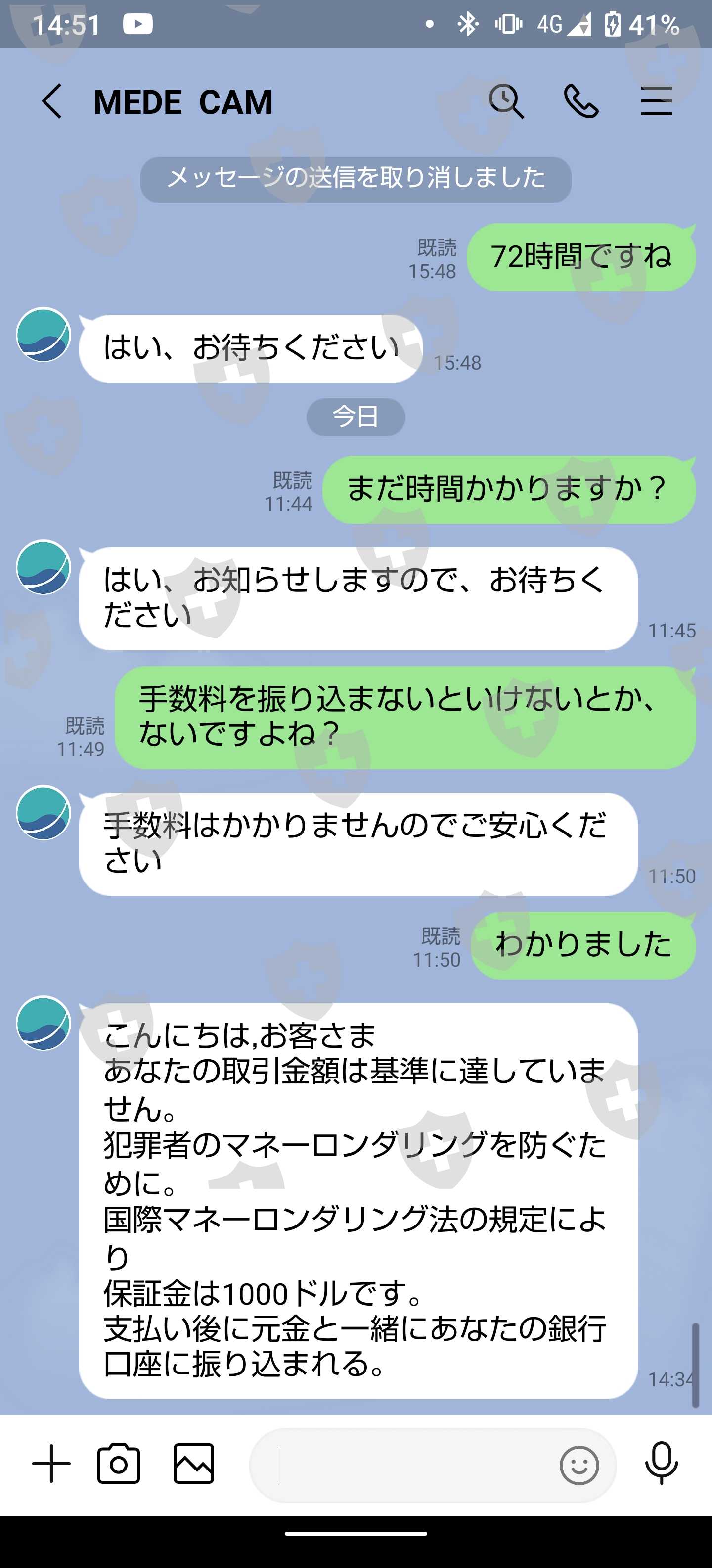 我在 Pears 遇到的一位女士指示我开设一家外汇招揽交易所。将460,000日元分3期存入线路账户指定的账户,您可以在该账户中教授MEDE的线路账户。即使您要求提款,您也需要支付 1000 美元。