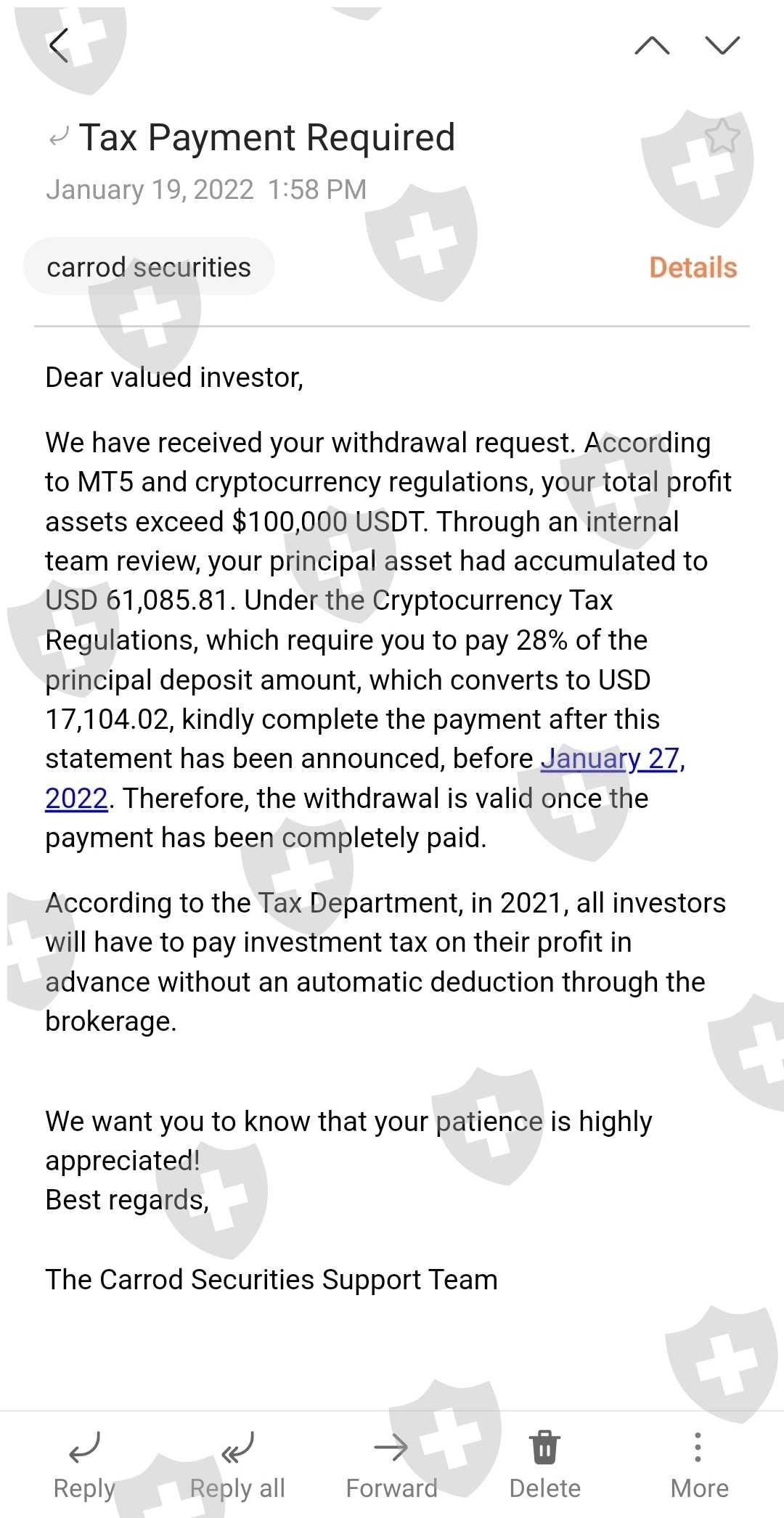 我在2021年12月28日与这家公司签约,22年1月20日想提取我的资金。交易商说必须为我的利润缴税。