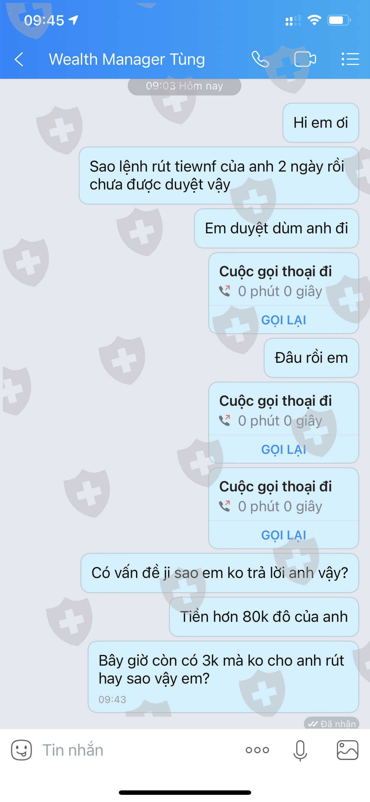 Sàn lừa đảo tự giao dịch thua lỗ và không cho rút số tiền còn lại. Nhân viên tự giao dịch thua lỗ dẫn đến cháy tài khoản của tôi gần 76.618 đô la và bây giờ tôi cũng không thể rút được số tiền còn lại hơn 3.109 đô la. Tôi làm lệnh rút tiền từ ngày 12/12/2021 đến nay vẫn chưa nhận được tiền. Tôi liên hệ bạn chăm sóc khách hàng tự giới thiệu là chuyên viên quản lý của sàn nhưng rất nhiều lần vẫn không trả lời. Yêu cầu sàn trả lại tiền cho tôi. Tôi sẽ đăng đến khi nào nhận lại được tiền của tôi.