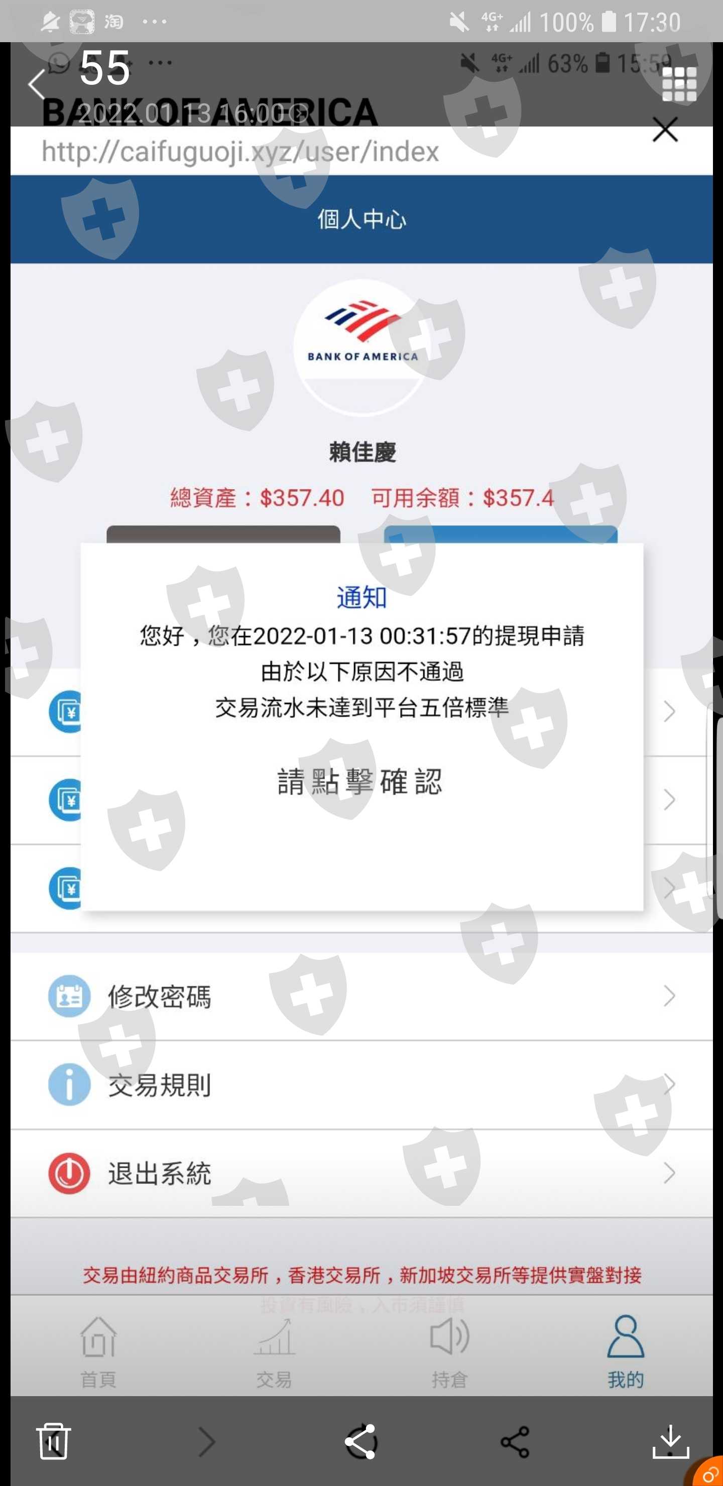 有一位名叫阿誠的LINE的人,在投資群組說需要投資原油的人可以找他,加了LINE之後,他就貼出他跟一位老師投資原油的獲利的帳單,說行情很好可以趕快跟老師一起操作,他便推薦了他的自己的平台,想到這一入金之後再也無法出金了,首先是投資的老師叫做精誠所至,他也是個騙子,他就說要入至少30萬的底倉才可以入他的群組操作,說什麼入太少風險太大賠錢就是破壞他的名聲,總共入了1800多的泰達幣,平台上的客服也是不折不扣的大騙子,首先是說要5倍的流水,又達到了又說泰達幣的通道不符合,最後真的有贏錢了又說被黑客攻擊,總之就是不能出金,我不希望各位在上當了