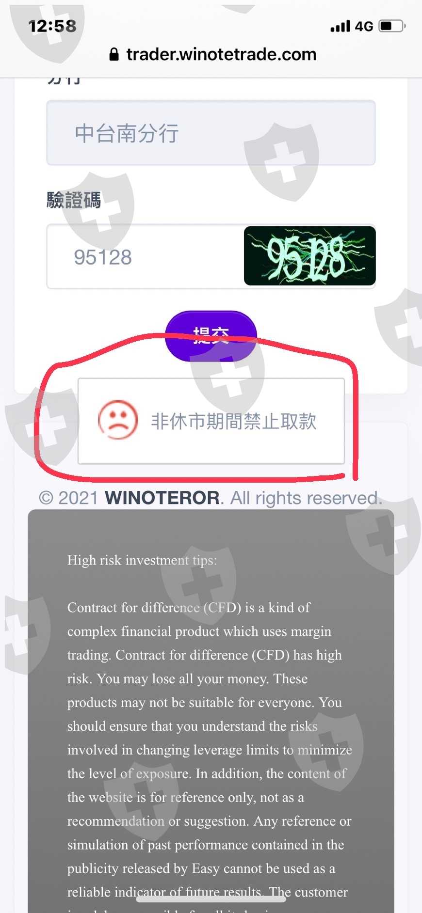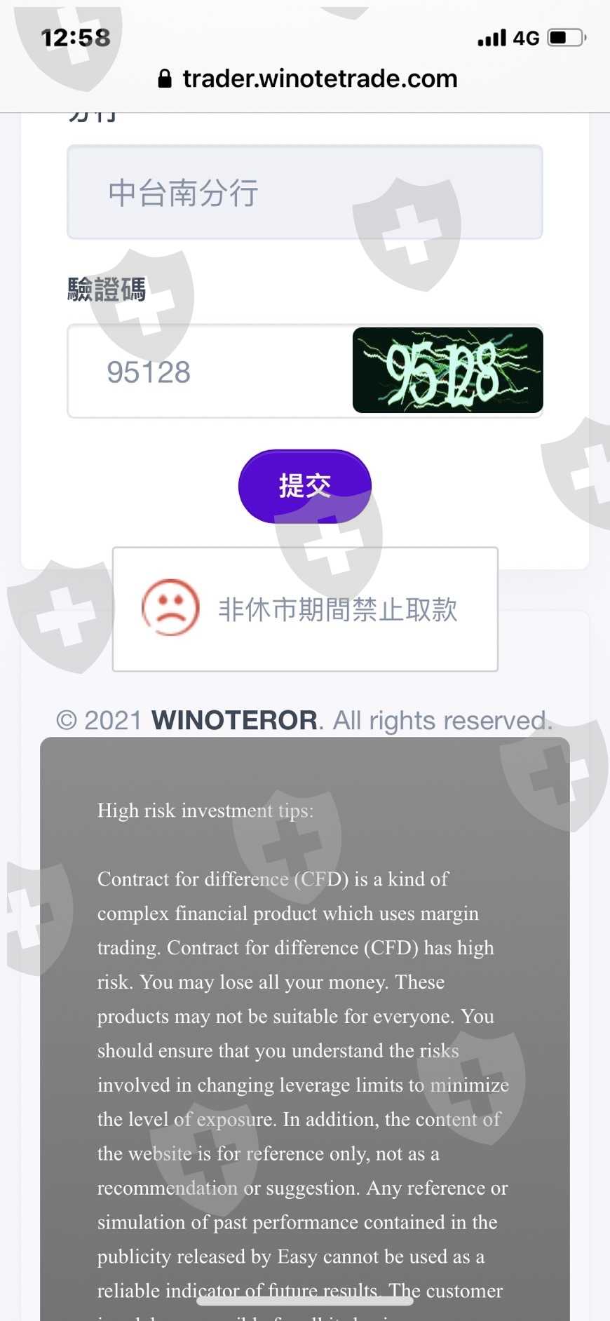 我在12月中旬投資量化交易winoteror的平臺、在1月24日要出金時確發現禁止取款訊息、當時我問蘭溪投顧服務員,他說要在27號才能取款,結果26號當天我被退出服務群組也被封索才驚覺到有問題了,今天27號了還是無法出金也找不到那位服務員了