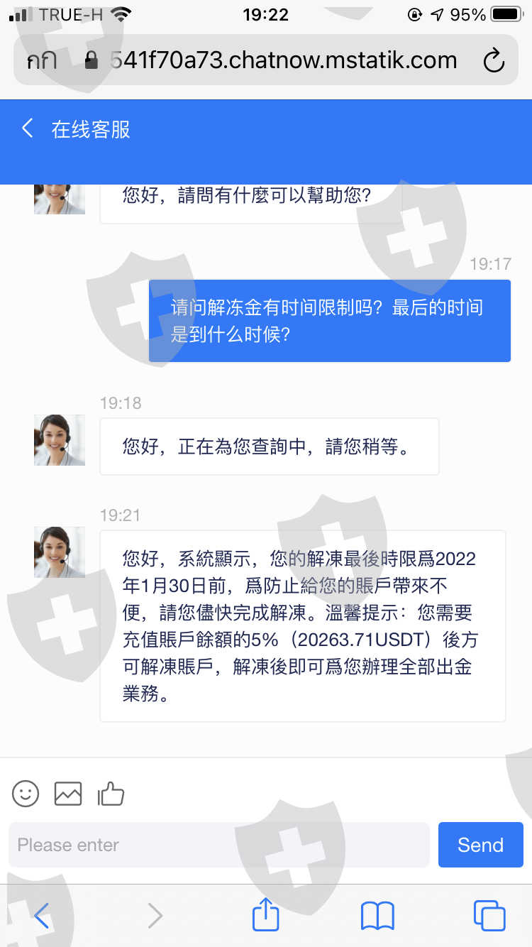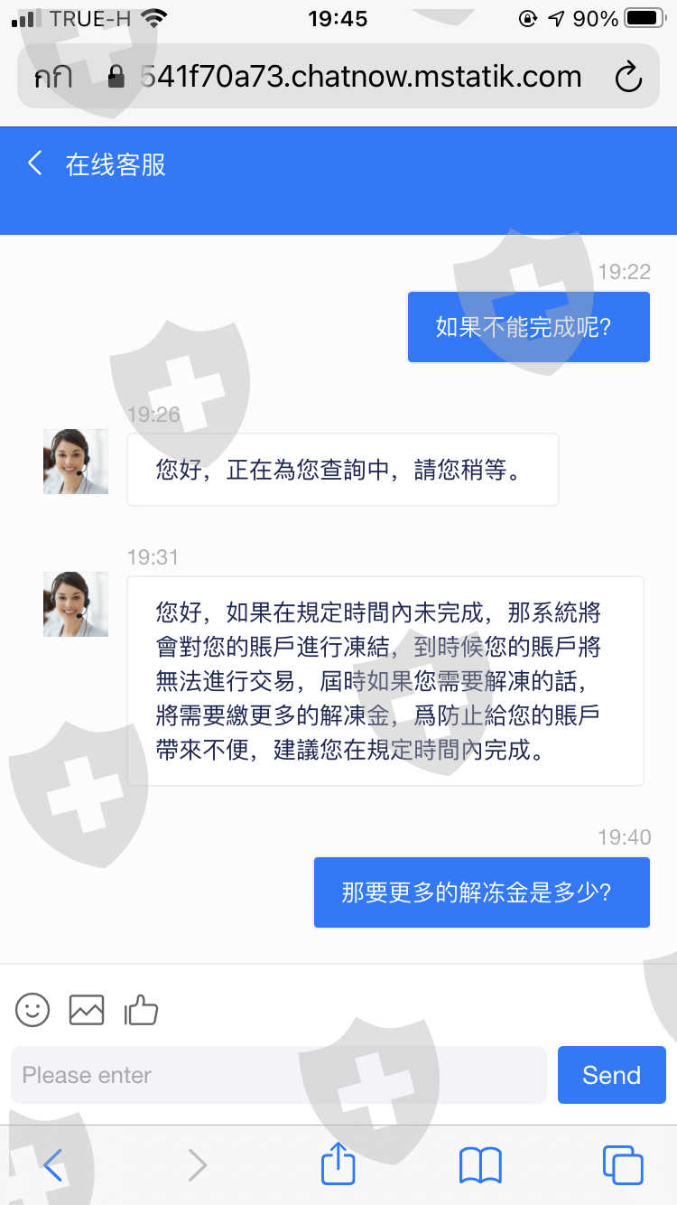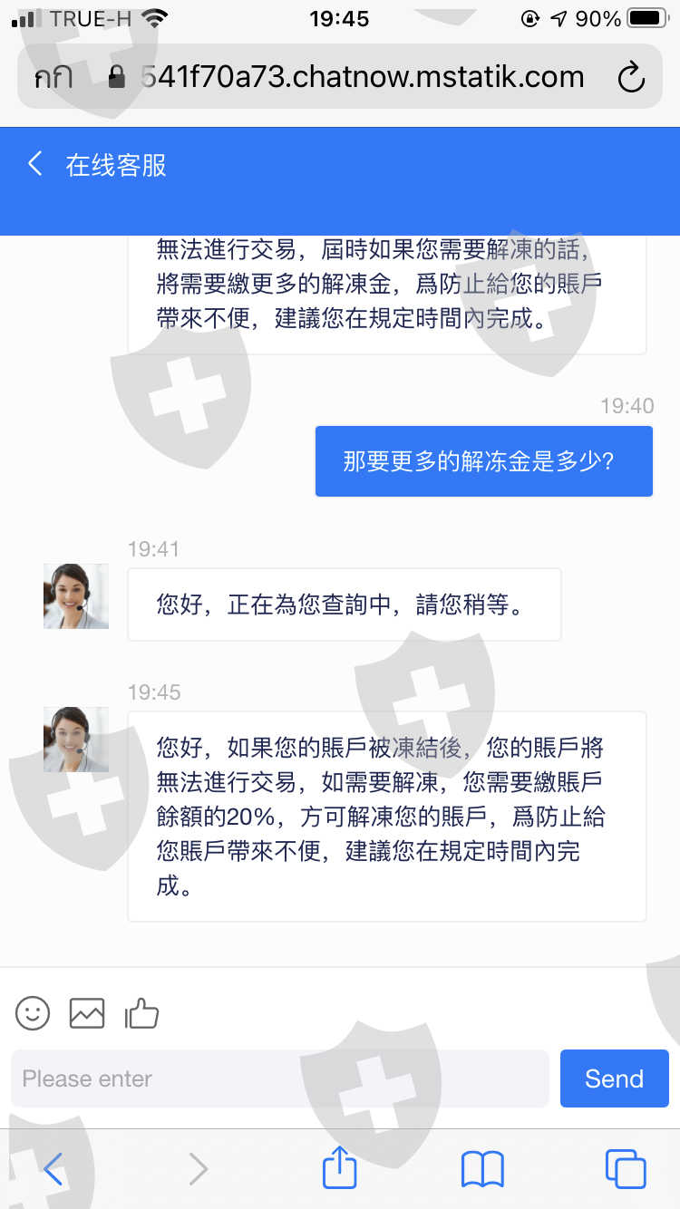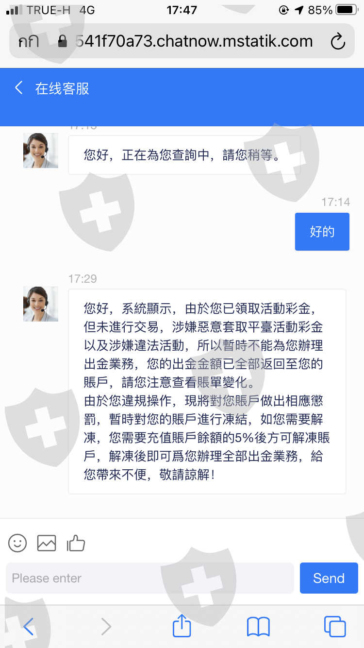 ฝ่ายบริการลูกค้าแจ้งว่าต้องเติมเงินให้ครบจำนวนที่กำหนด พอเติมครบแล้วถอนเงินถูกกล่าวหาว่าฟอกเงินถูกล็อกบัญชี ต้องเติมเงิน5%ของยอดเงินในระบบ ถ้าไม่เติมในระยะเวลาที่กำหนดต้องจ่ายเพิ่มเป็น20% ทำให้ไม่สามารถถอนเงินออกมาได้