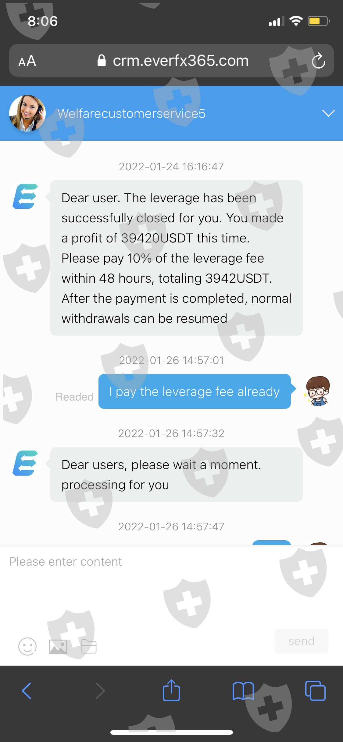 我是泰国人,我想将我的47132.00USDT全部取出,但该交易商要收取不同的费用,第一次是10%的杠杆费,然后,他们说我还得支付12%的个人所得税,金额达5655.84USDT。后来,他们又要我支付10%的转账费,金额达4793.85USDT。我想取消出金,但是却没办法实现。他们跟我说我这是无理的要求,让我问银行。