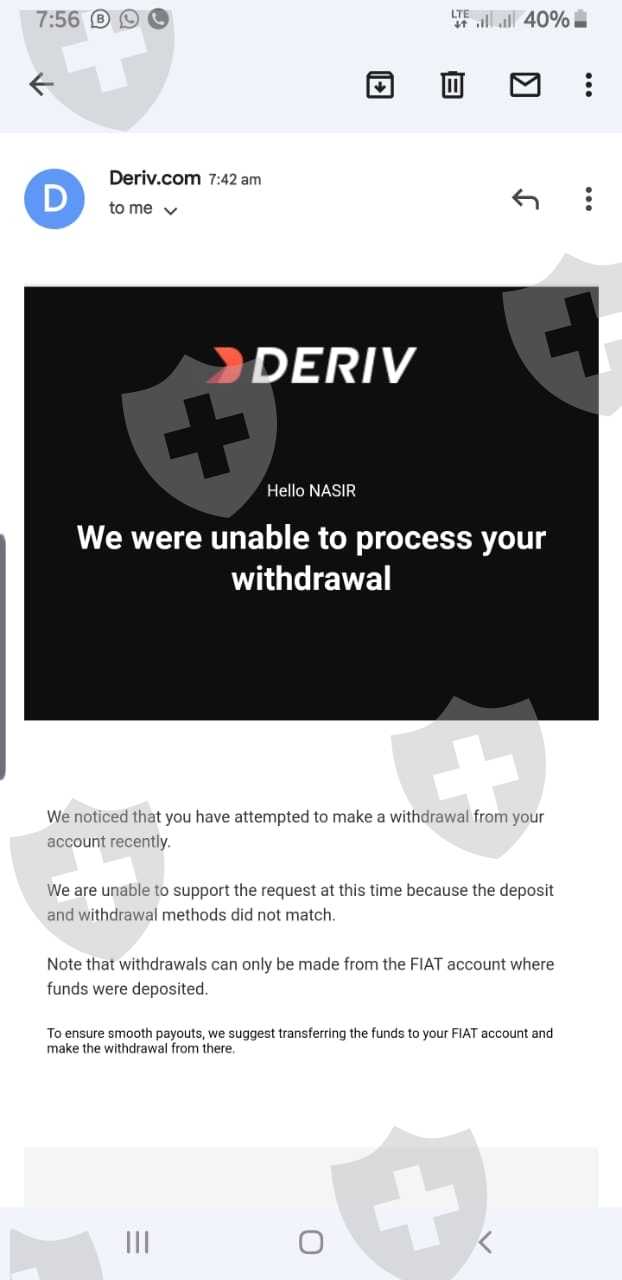 Deriv seems to be a be a suspicious Broker, They accept My deposit and permit me to get my first withdrawal within 24 Hours. I thought it was a good broker to trade with, therefore I added much money in to my trading account, but the next time I applied to withdraw my funds, then the continued to decline the request and saying that the withdrawal method doesn't match. which is the same withdrawal method I got my first withdrawal. please help me get my money