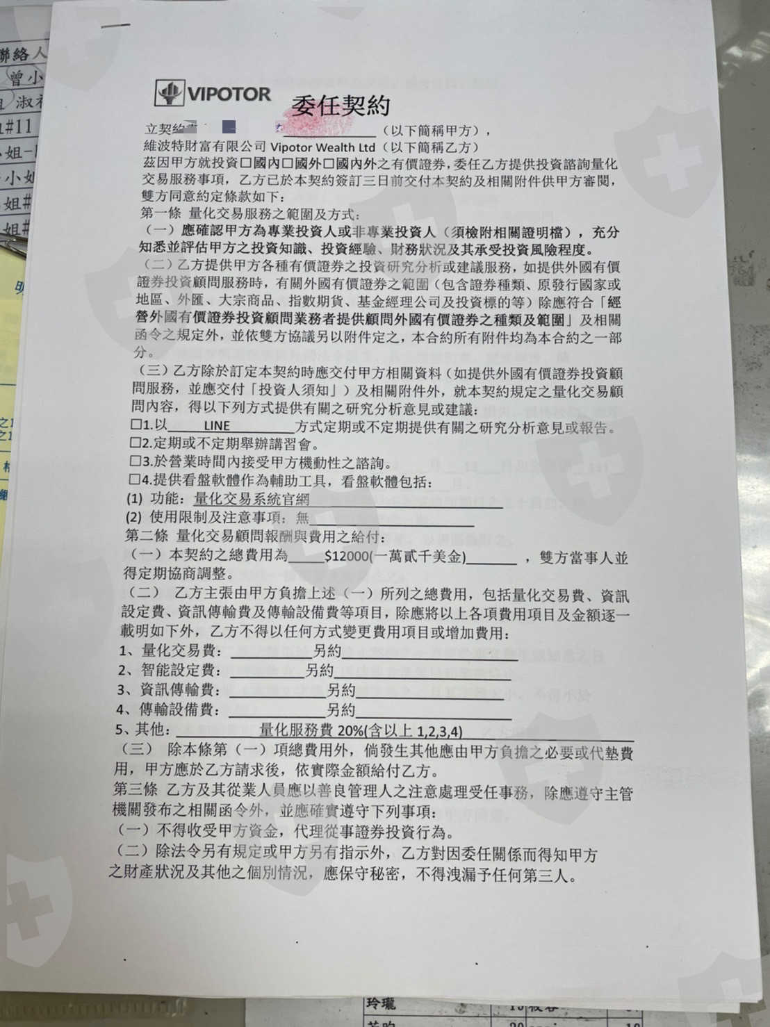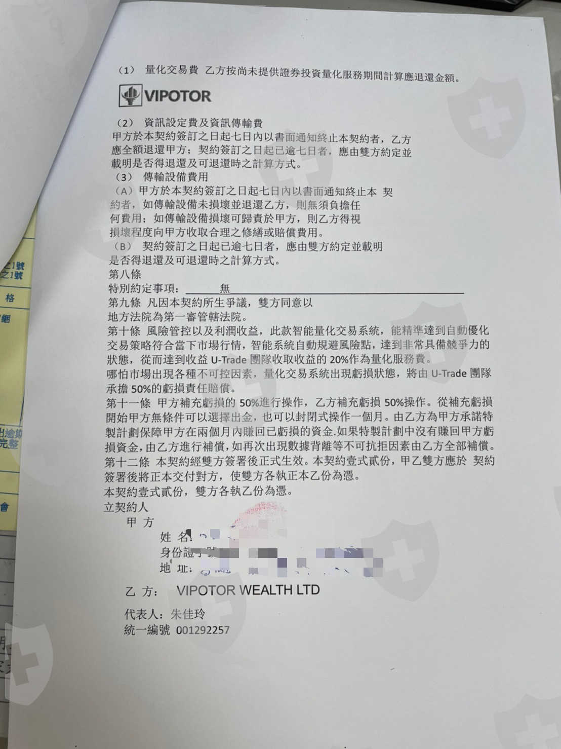 11月底左右接觸出自於洪天峰投顧公司,朱佳玲小姐推薦的量化交易,接觸不到兩個禮拜的時間(約12月初)出現第一次嚴重點滑,當時還有賠賞一半本金及簽合約書。過年前想先出金,結果說要付台幣十萬元保證金,因為要在付保證金所沒有順利出金,直到昨天2/9嚴重點滑後,立馬刪除群組,小姐Line不讀不回、打Line也不接,直接消失!